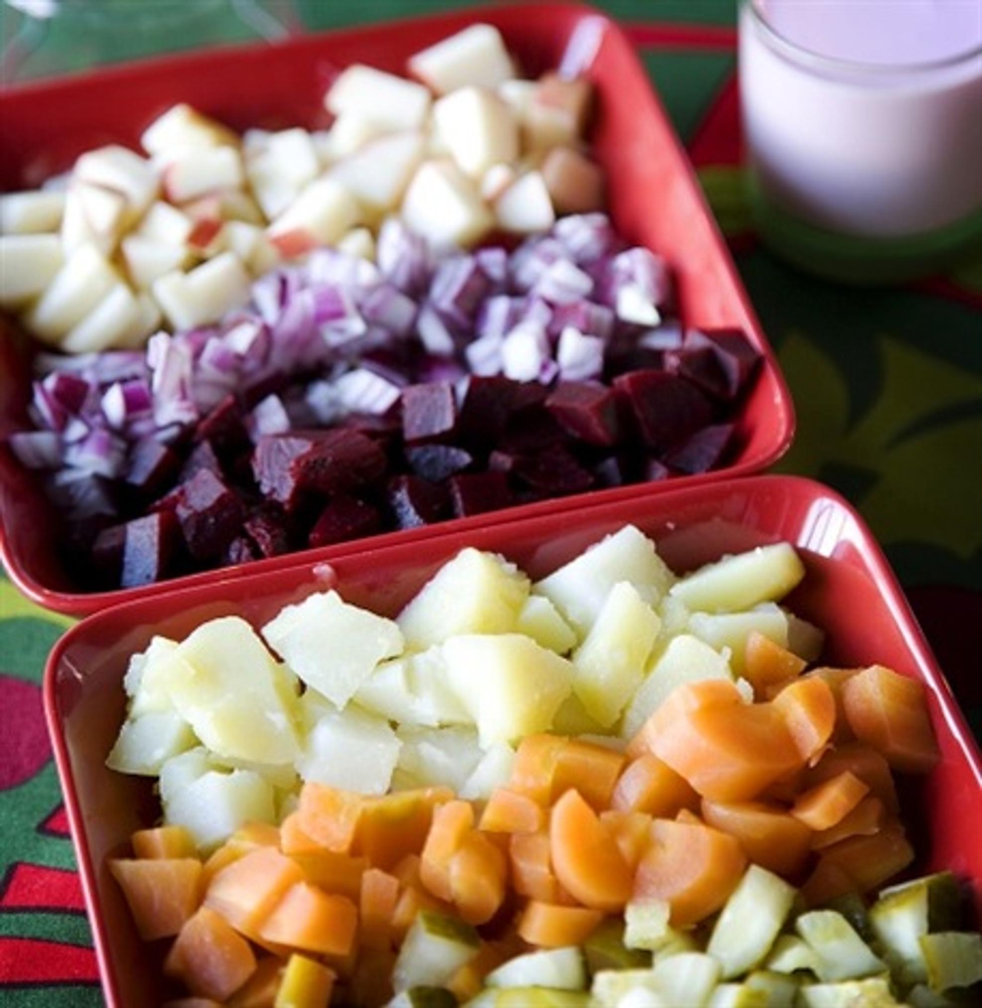 Myös kermaviilikastike on hyvä pari perinteiselle rosollille. Tässä joulusalaatissa maistuu tuttuun tapaan porkkana, peruna, punajuuri ja omena.
