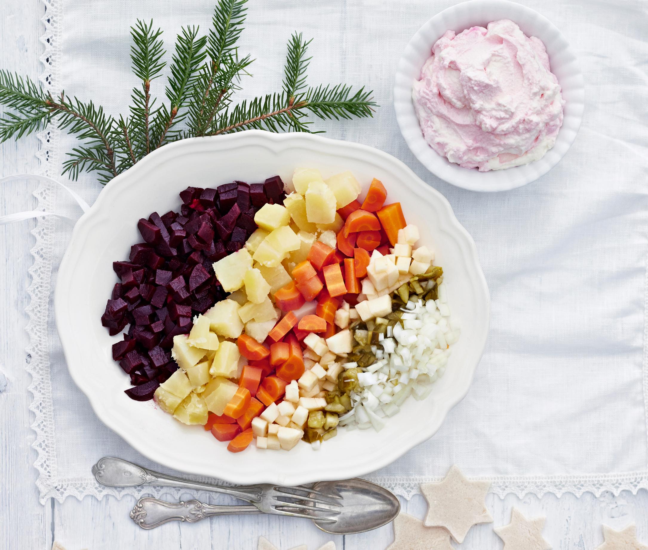 Rosollin kastike kruunaa jouluisen salaatin. Kastike valmistuu hetkessä kuohukermasta ja mausteista. Värjää kermavaahto halutessasi vaaleanpunaiseksi punajuurella.