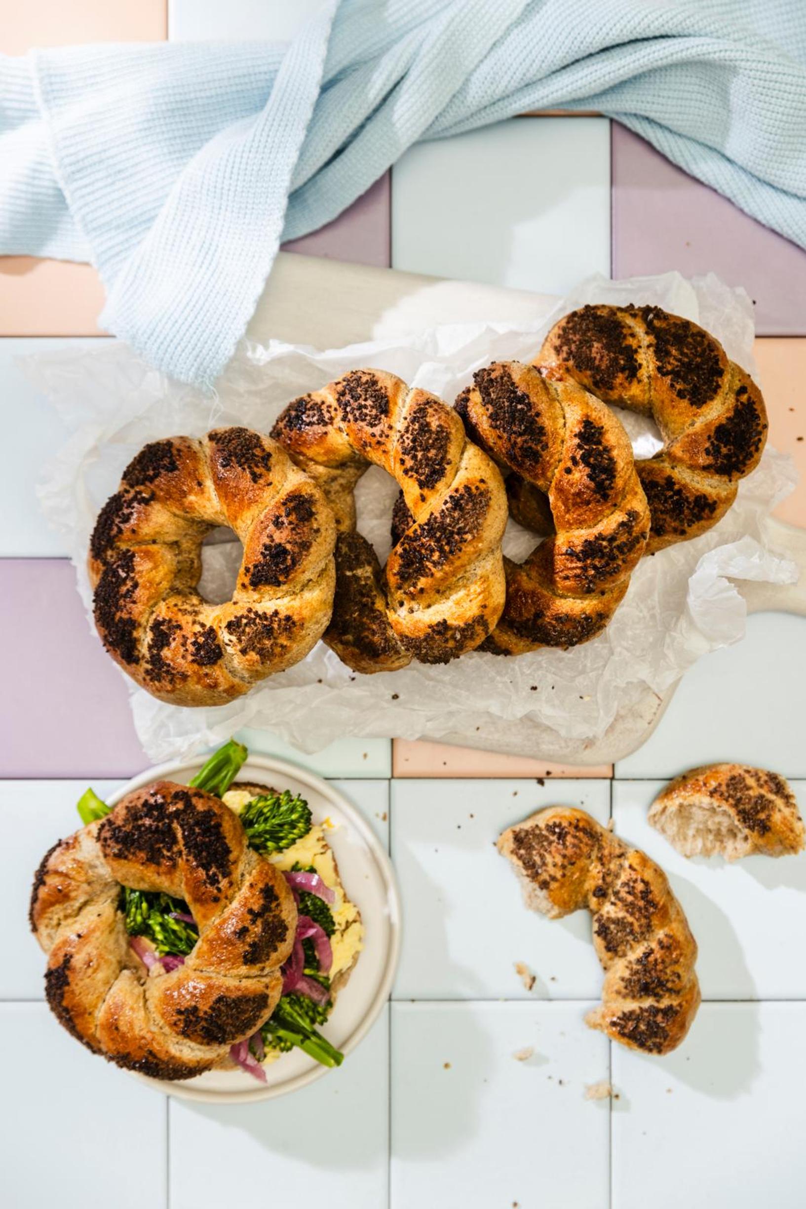 Pellavansiemenrouheella saat ruisbageleihin kauniin rustiikkisen pinnan. Saat bageleista mainion viikonloppuaamupalan tai brunssiherkun, kun täytät ne munavoilla, marinoidulla punasipulilla ja kevyesti paistetuilla varsiparsakaaleilla.