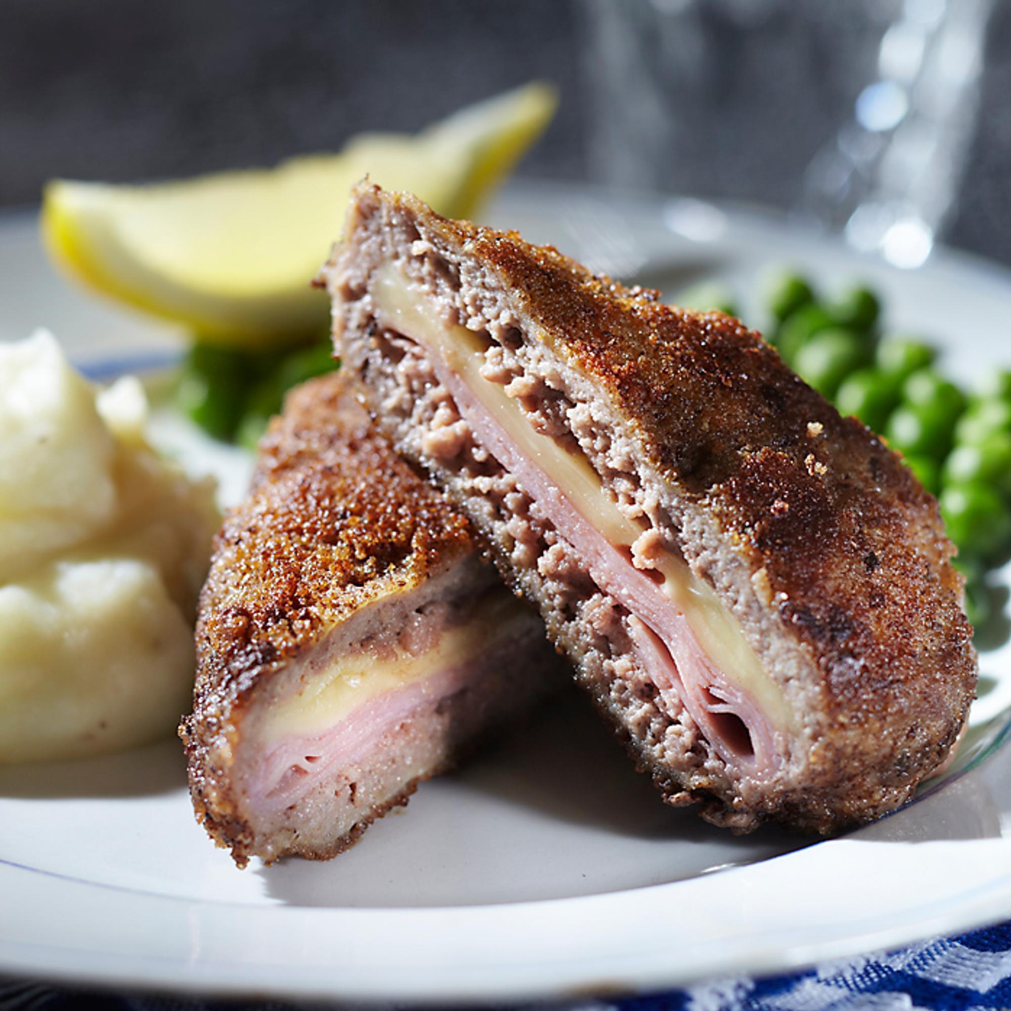 Viipaloi kinkku ja juusto ja lado kerroksittain pihvien toisille puoliskoille. Ummista pihvit ja tarkista, että jauheliha peittää täytteet kunnolla.