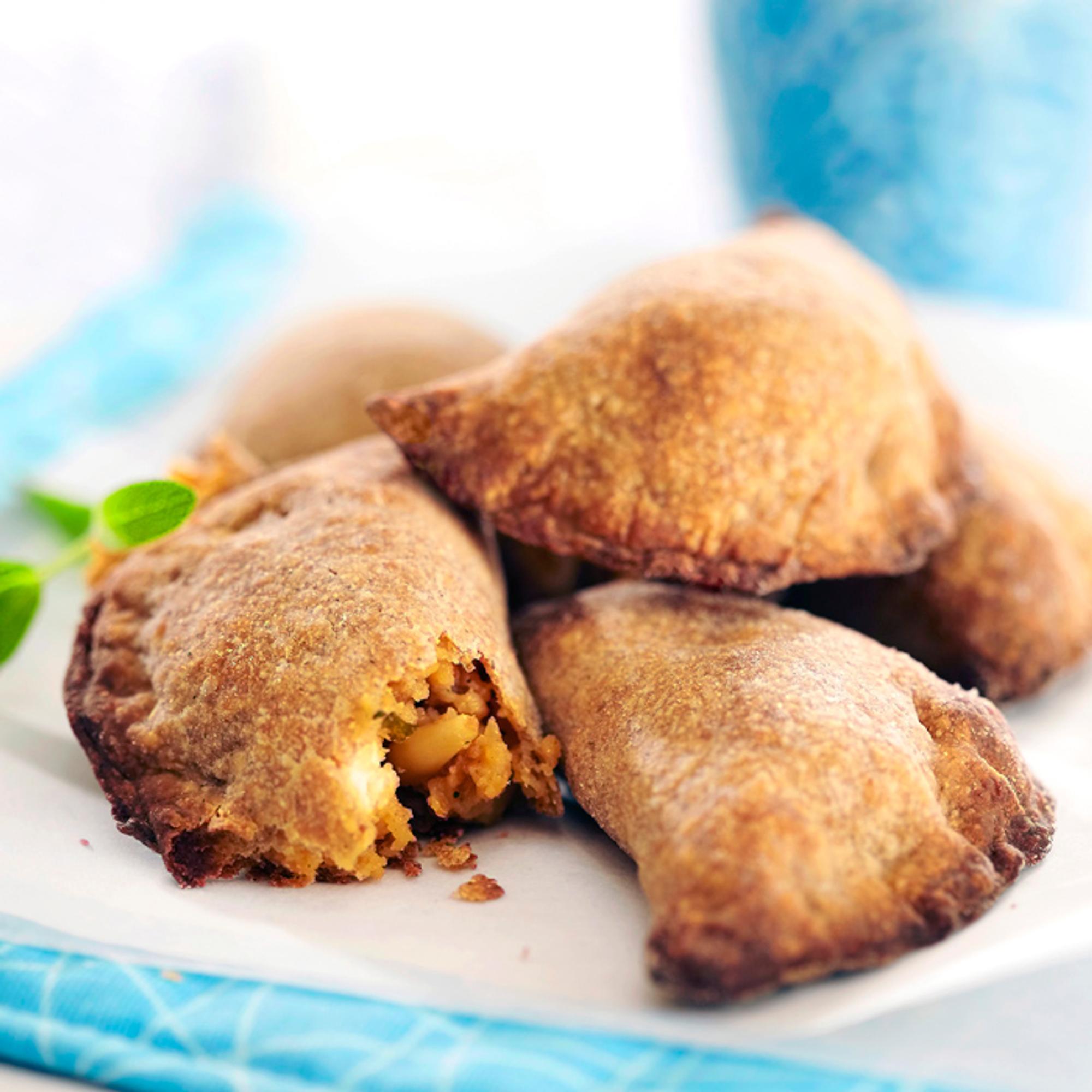 Nosta teelusikallinen täytettä taikinapalalle. Sipaise taikinareunat veteen kastetulla sormella ja taita puolikuun muotoisiksi pasteijoiksi. Painele saumakohta tiiviiksi sormella tai haarukalla, niin täyte ei karkaa uunissa.