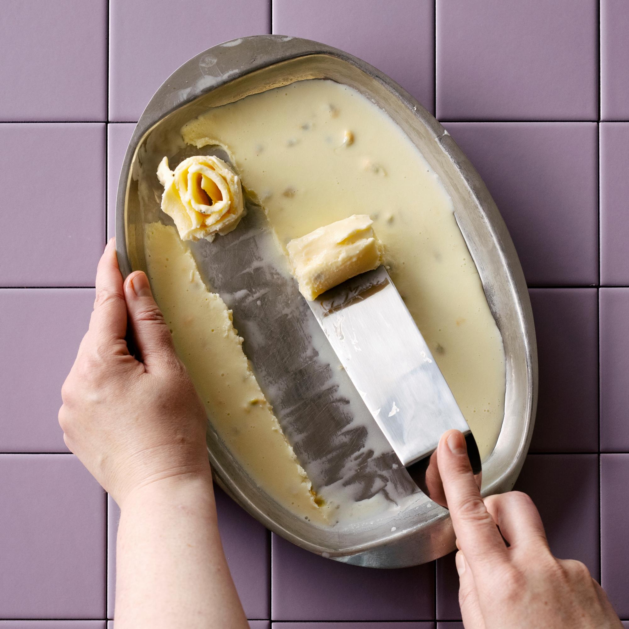 - Ota tarjotin kerrallaan pakastimesta, paina lasta tarjotinta vasten ja työnnä lastaa varovasti tarjotinta myöten eteenpäin niin, että jäätelö kääntyy rullalle.