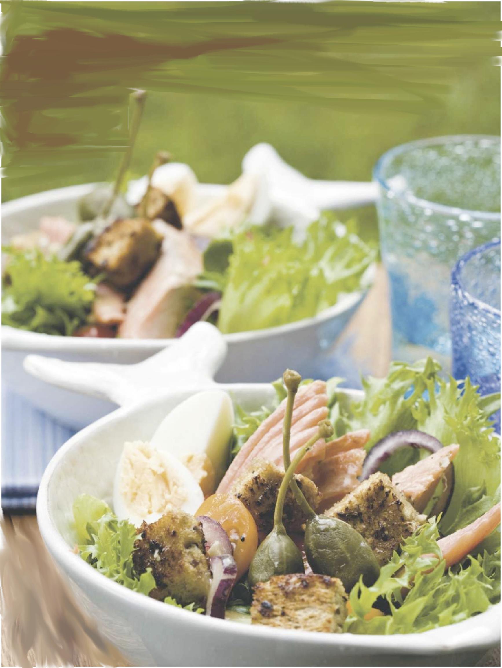 Asettele savukala, munat, kurkut, tomaatit, sipulit, kaprikset ja krutongit salaatinlehtien päälle kauniisti. Kaada lopuksi kastike.