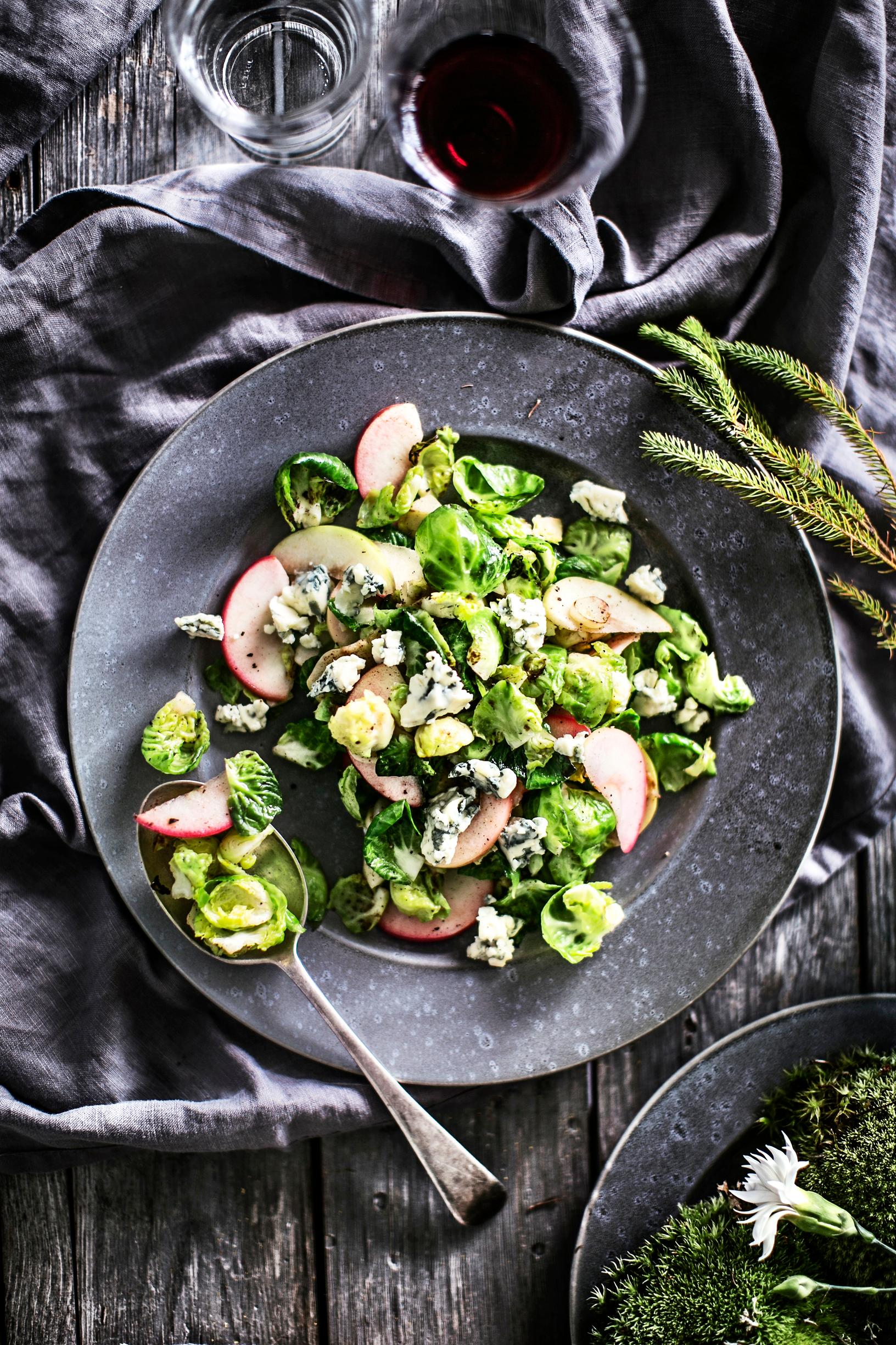 Ruusukaalisalaatti hurmaa juhlapöydässä paitsi maullaan myös ulkomuodollaan. Nopeasti pannulla paistetut ruusukaalinlehdet säilyttävät upean vihreän värinsä, jota omena ja sinihomejuusto täydentävät tarjoiluvadilla. Kokeile ja ihastut!