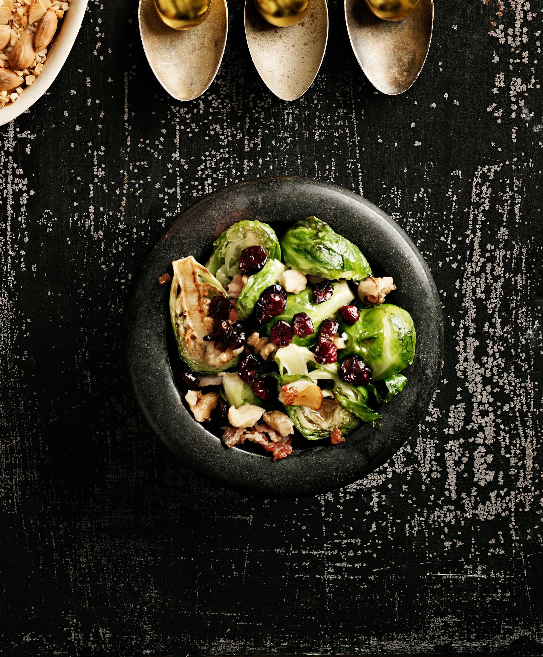 Ruusukaalit pekonilla – pikapaistetut kaalit höystetään vaahterasiirapilla, pähkinöillä ja karpaloilla