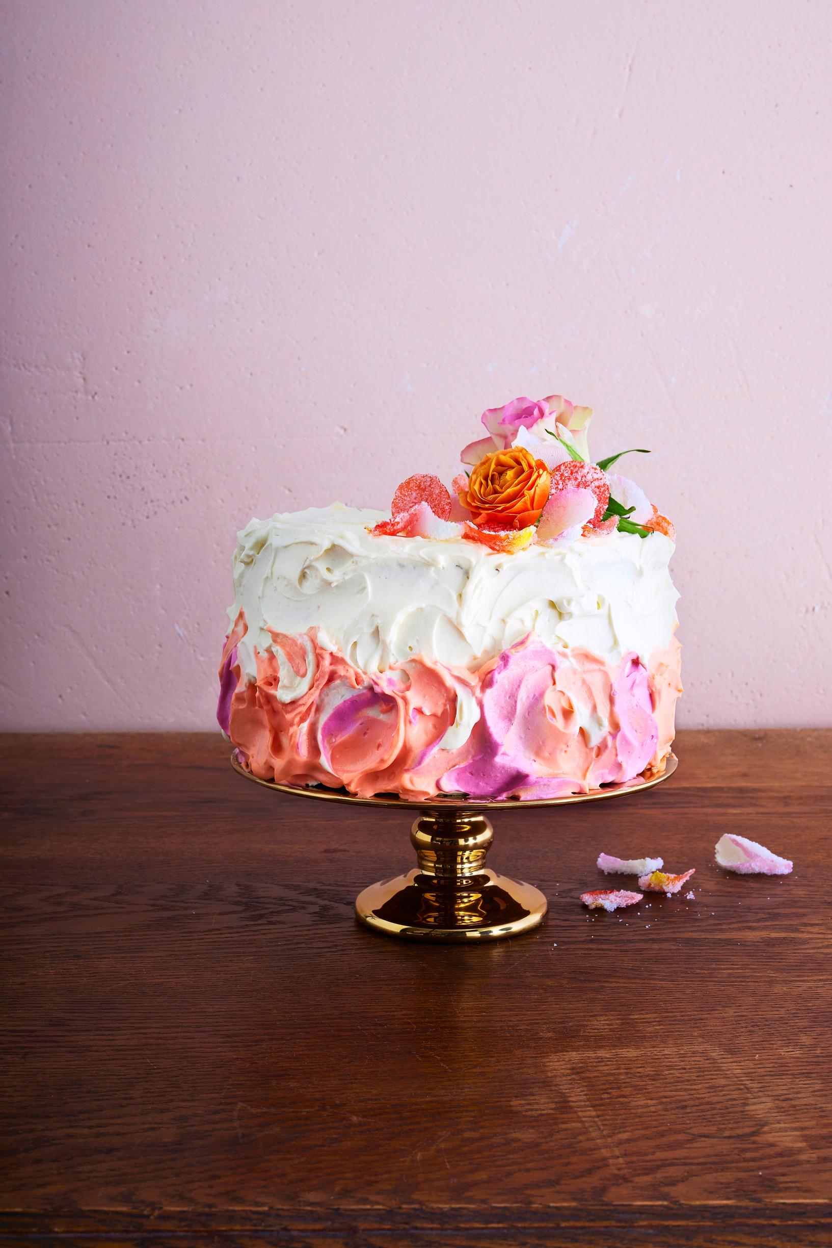 - 11Siirrä kakku lautaselle. Kuorruta kakku ensin valkoisella kuorrutuksella kakun päältä ja yläosasta. Voit levittää ohuen kerroksen valkoista myös alaosaan. Levitä roosaa ja persikanväristä kuorrutusta kakun alaosaan. Viimeistele reuna palettiveitsellä niin, että värit hieman sekoittuvat. Koristele kakku ruusuilla ja kandeeratuilla terälehdillä.