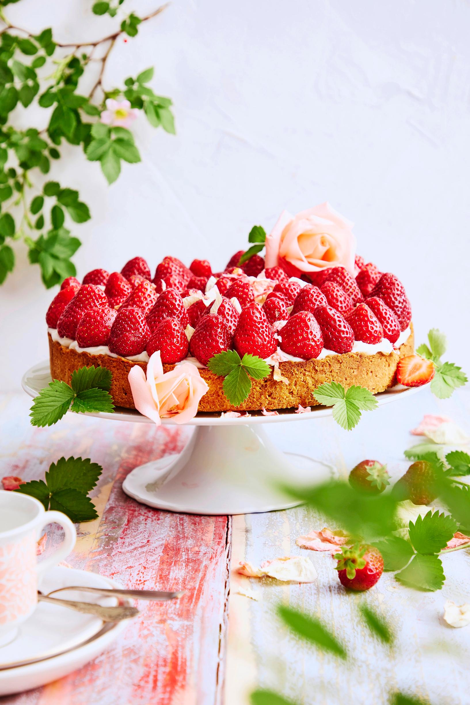 Mansikkatortun täytteessä maistuu ruusuvesi. Torttupohjan voi hyvin leipoa päivää tai kahta ennen h-hetkeä. Täyttäminen kannattaa jättää viimeiseen tuntiin ennen tarjoamista, sillä mehukkaat mansikat kostuttavat muuten rapeaa pohjaa.