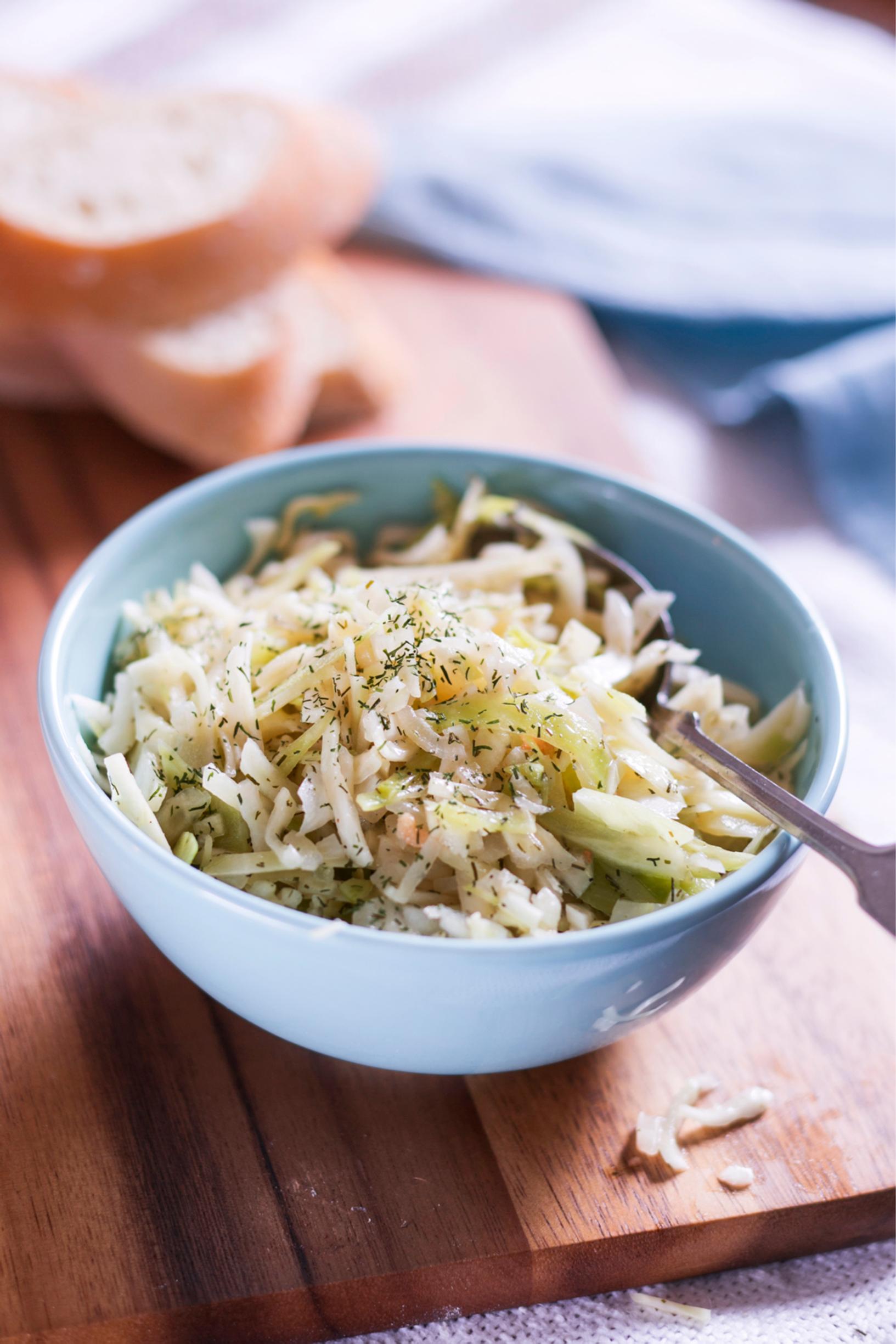 Kaada lämmin liemi kaalisuikaleiden päälle. Mausta salaatti tillillä ja pippurilla, sekoita hyvin.