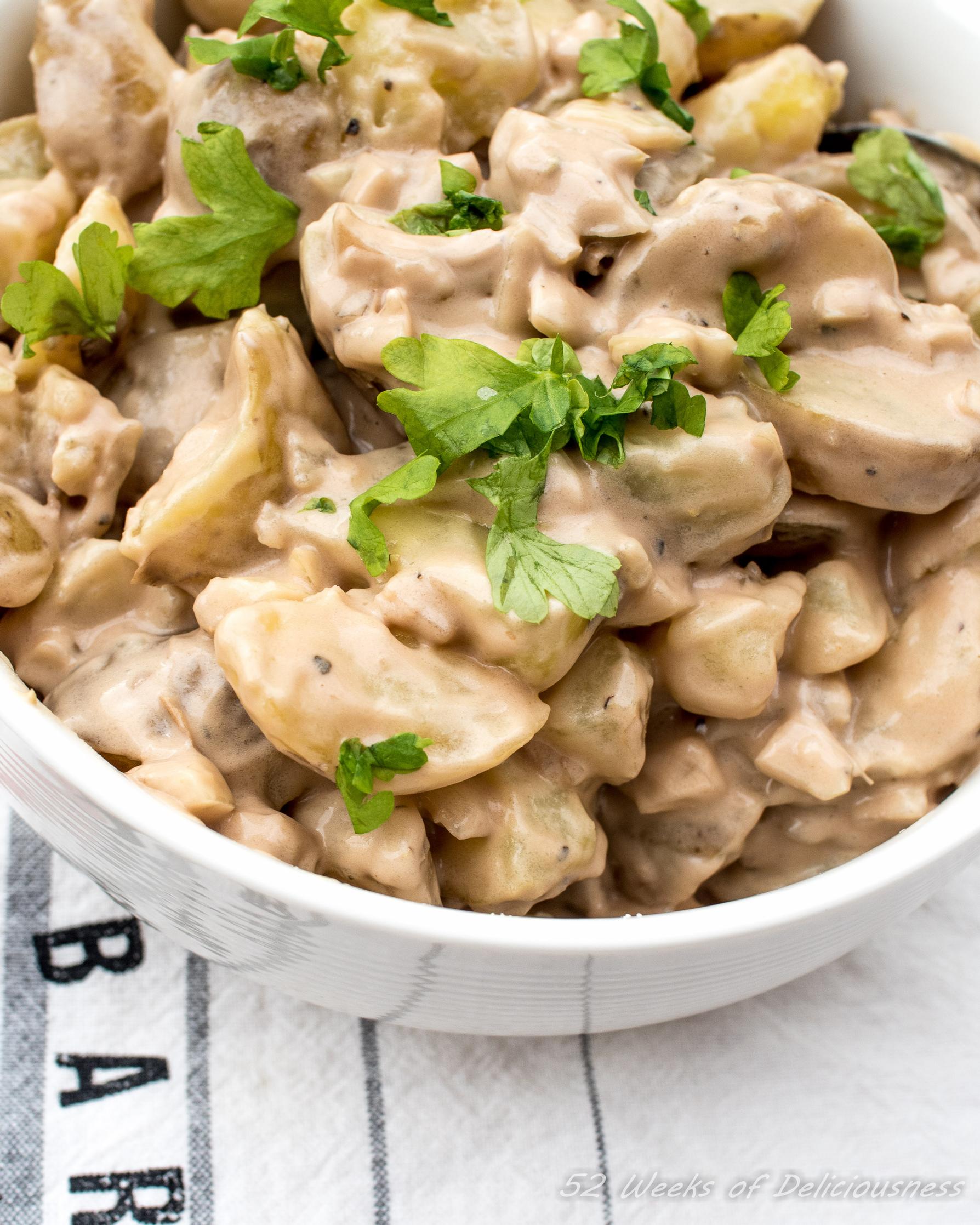 Saksalaisen perunasalaatin salaisuus on ranskankerman mehevöittämässä kastikkeessa, joka maustetaan balsamicolla ja sitruunalla.