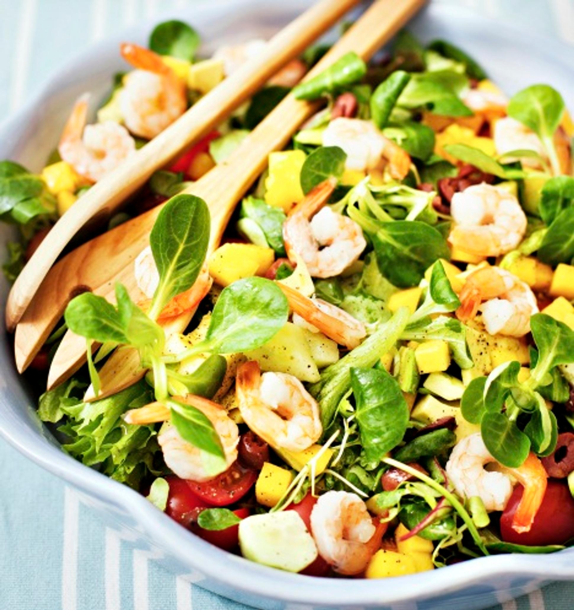 Salaatti avokadosta, mangosta ja paistetuista katkaravuista