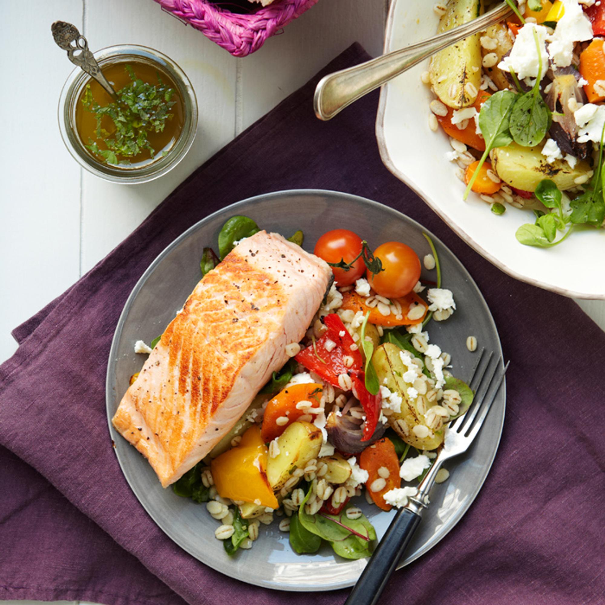 Murenna salaatin pinnalle fetajuusto ja viimeistele tuoreella vihreällä salaatilla. Tarjoile paahdetuista kasviksista ja ohrasta koottu salaatti sellaisenaan tai vaikkapa paistetun kalan tai broilerin kanssa.