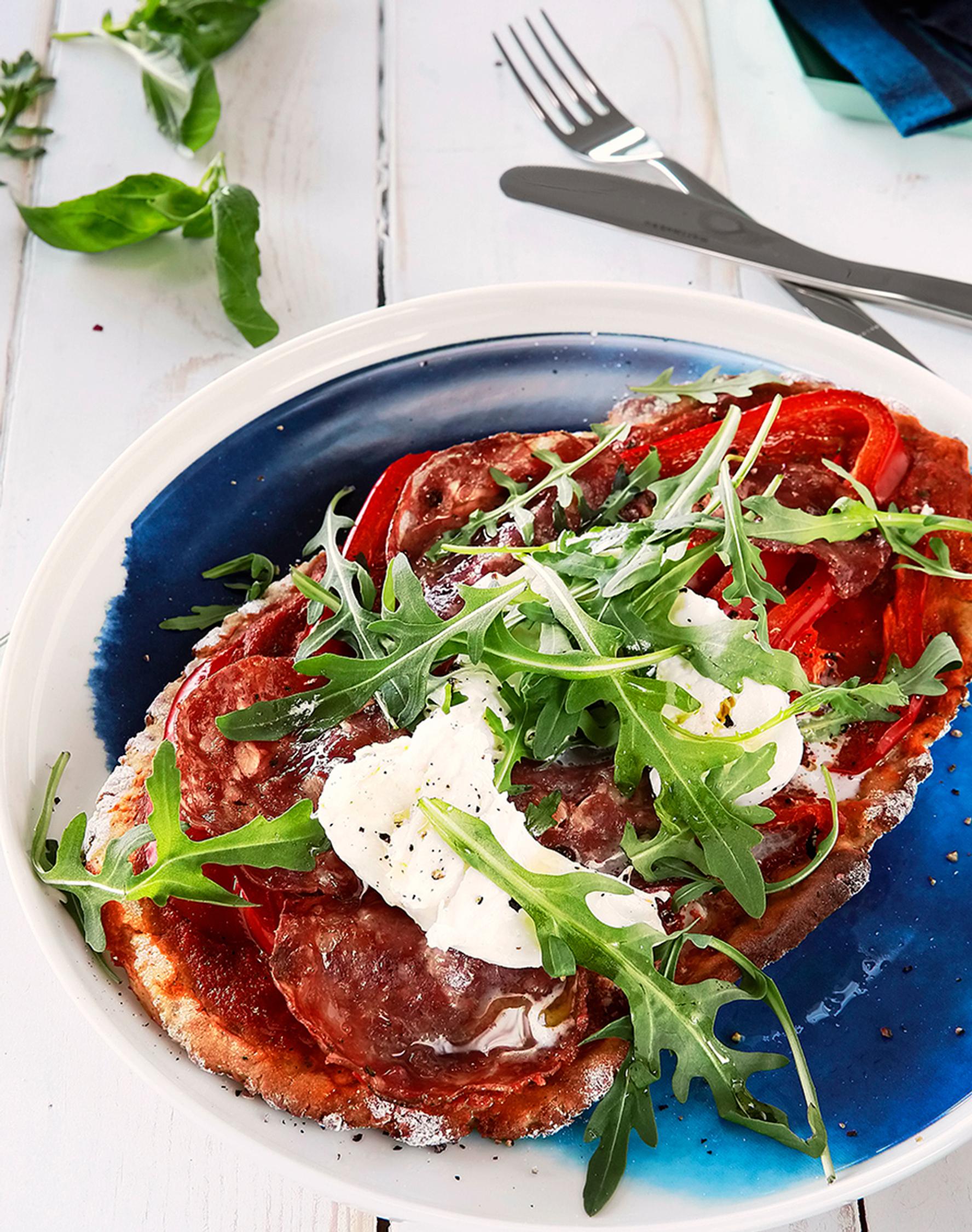 Levitä pizzapohjille ensin tomaatti-pastakastiketta, sitten salamia ja paprikaa.