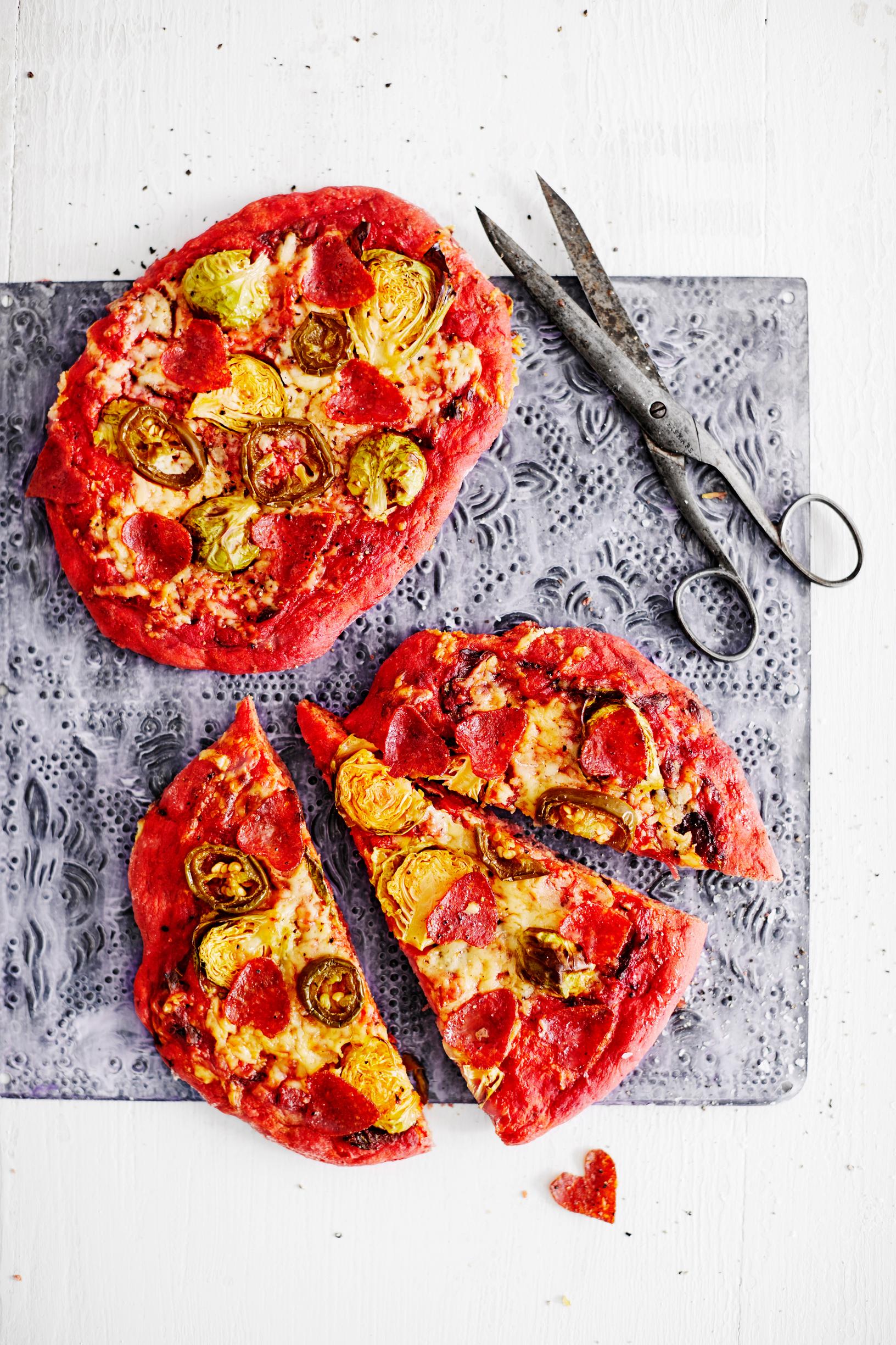 Salami-ruusukaalipizzat saavat kauniin purppuran värin punajuuriraasteesta