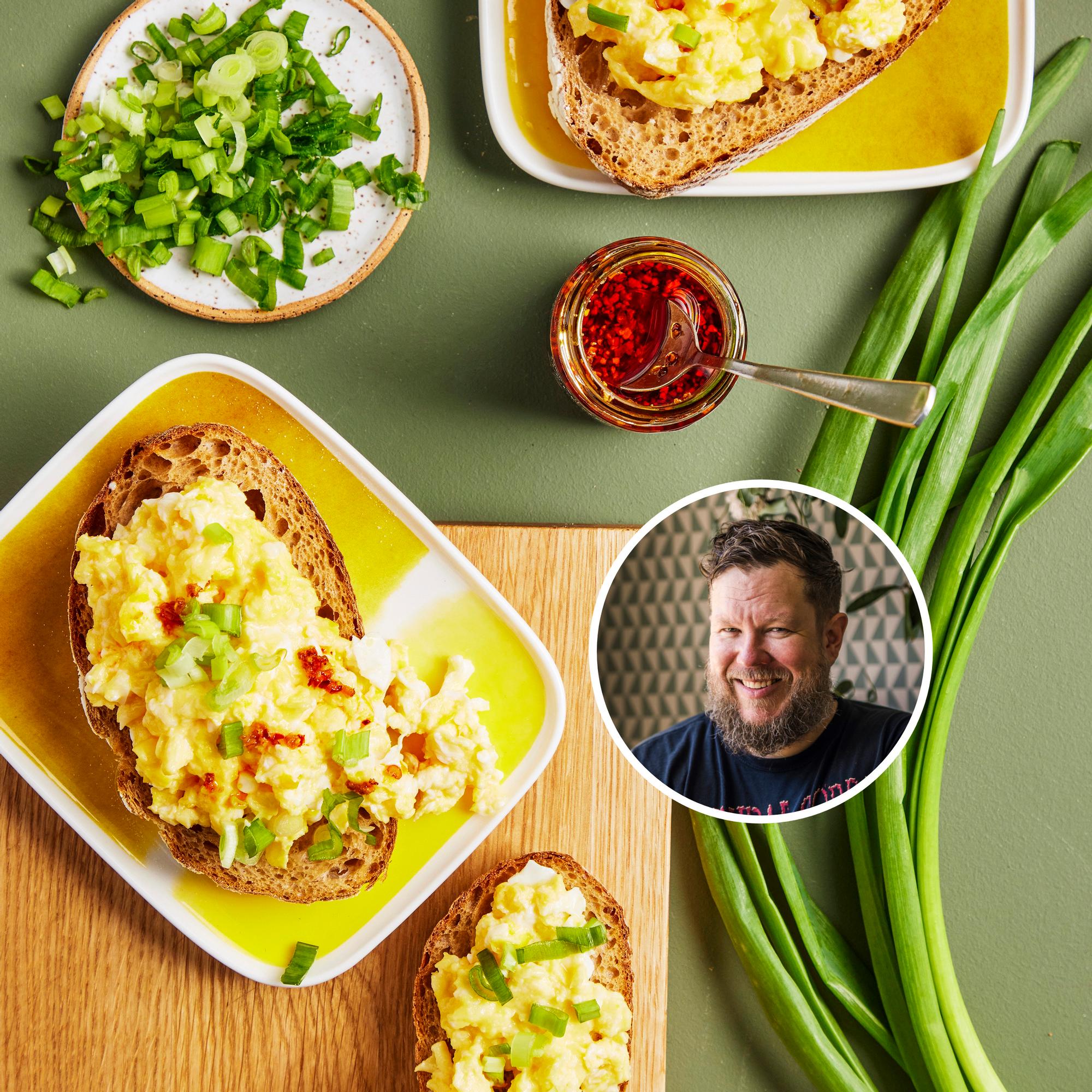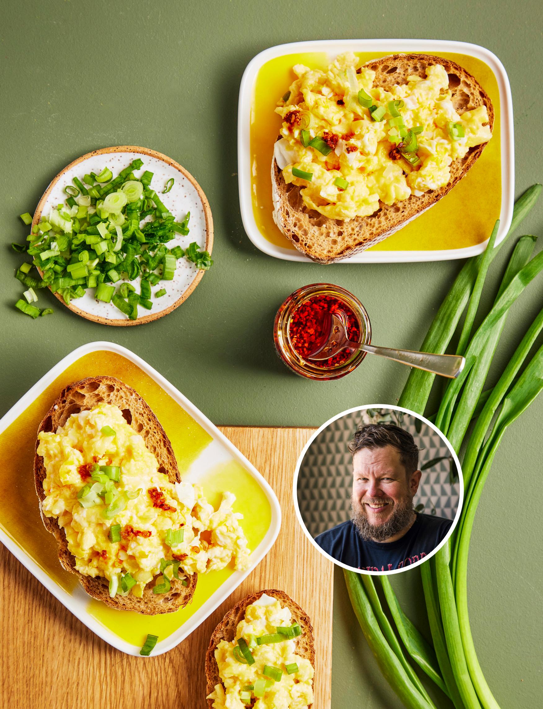 Laulaja ja lauluntekijä Samae Koskisen munakokkelileivät ovat tuttuja mökkivieraille. Pehmeän mehevä munakokkeli tarjotaan rapean chiliöljyn ja kevätsipulin kanssa.
