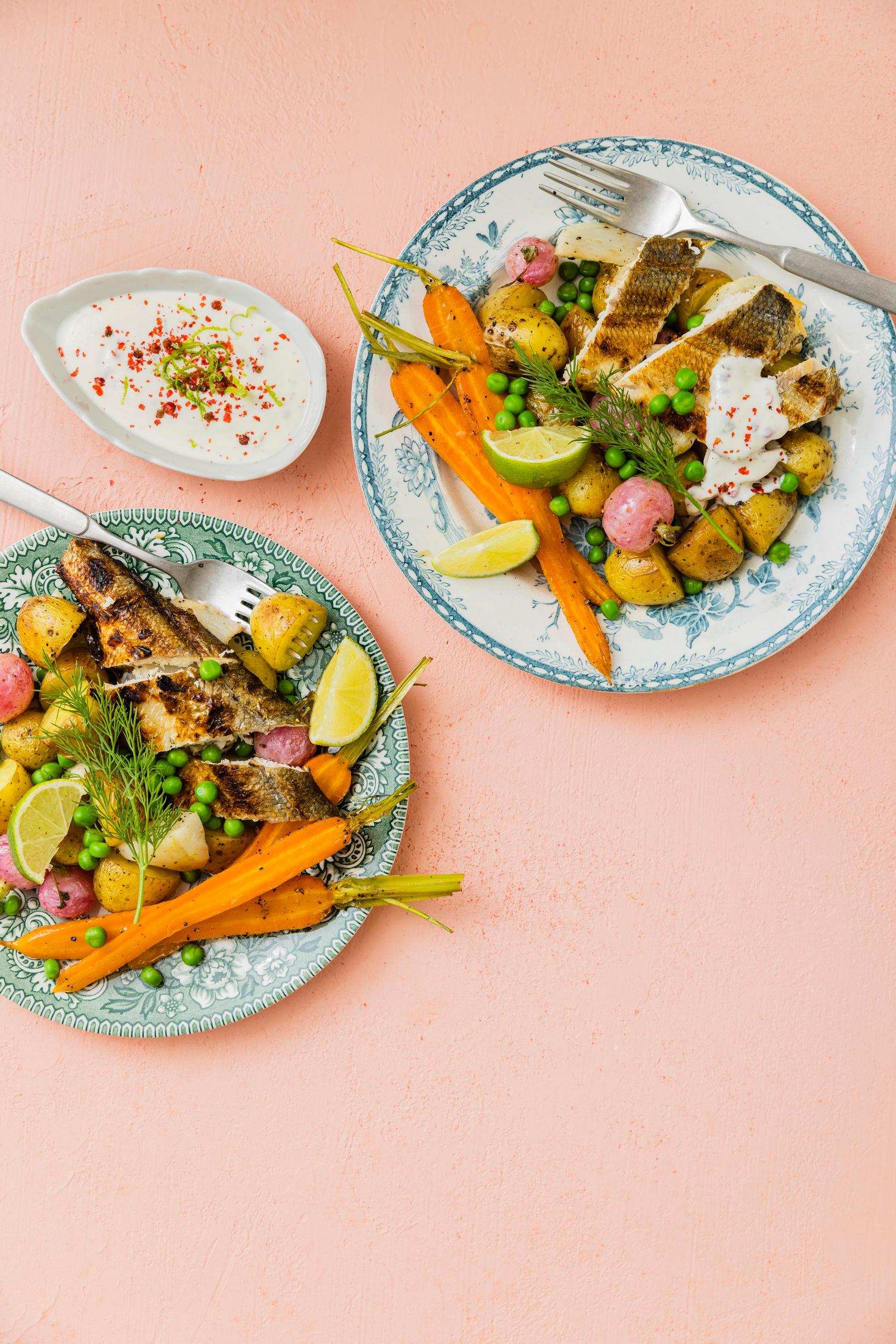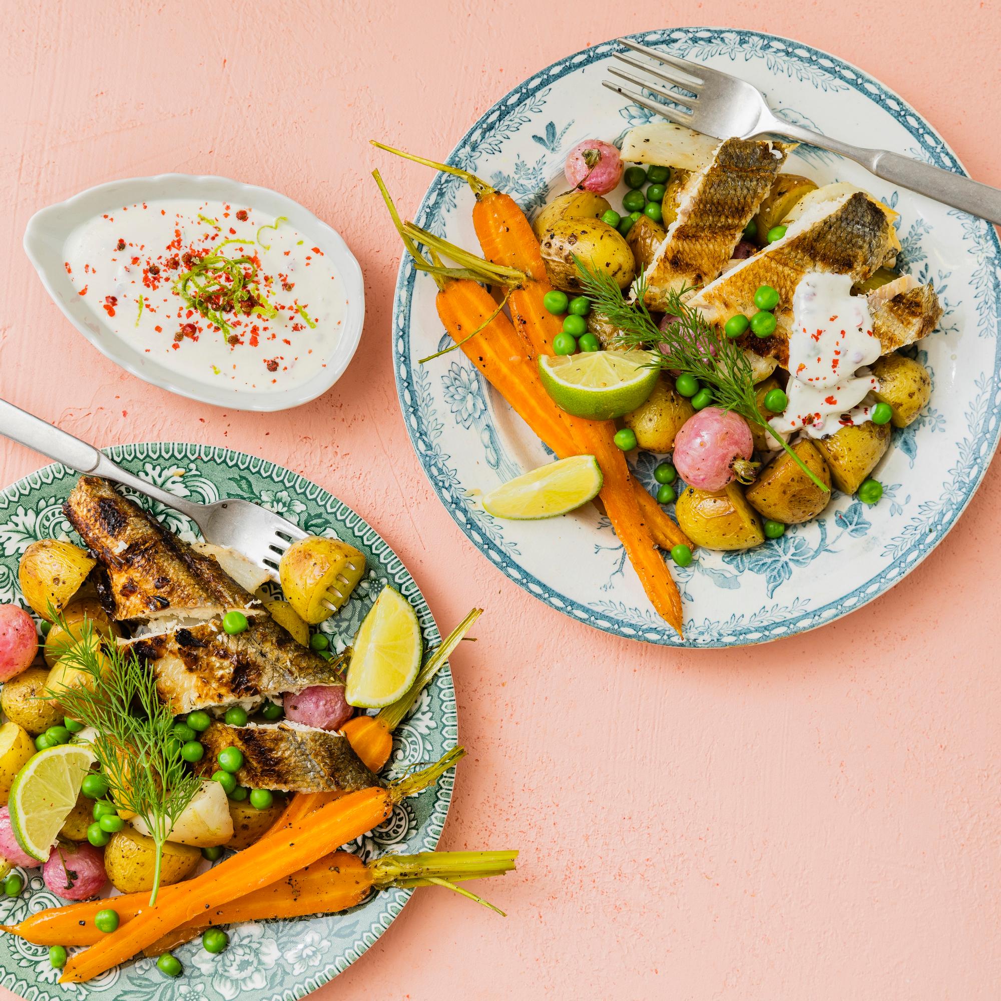 Savukalasalaatti – maukas yhdistelmä paahdettuja kasviksia, kalaa, herneitä ja kermaviilikastiketta!