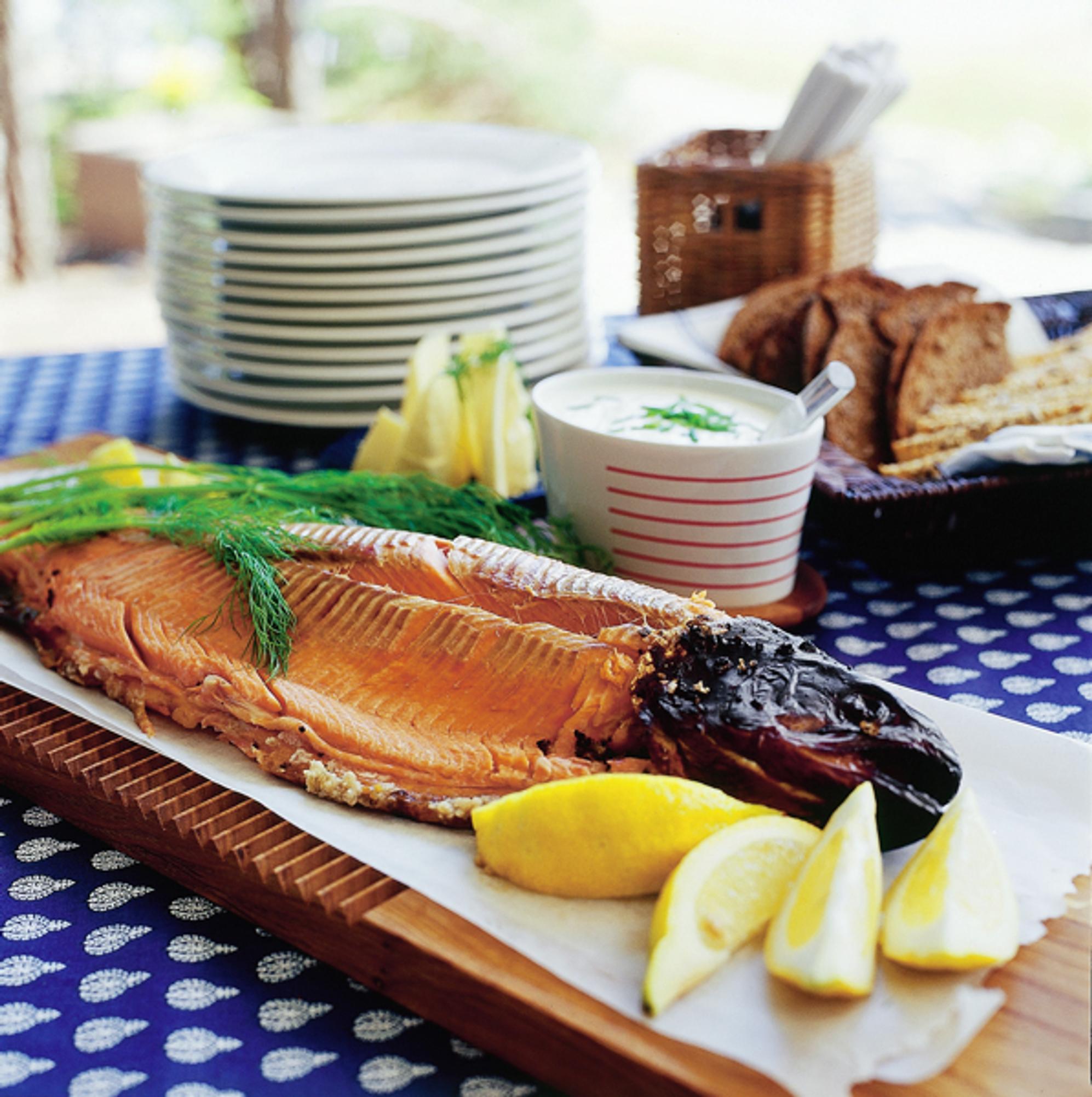Nosta savustetut kalat tarjoilulaudalle. Leikkaa nahka kylkiviivaa pitkin auki, niin saat nahan rullattua kauniisti sivuun.
