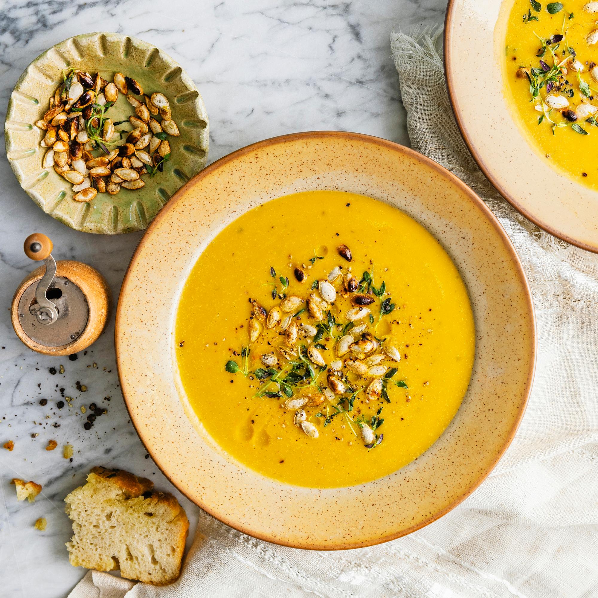 Kurpitsakeitto on syksyinen suosikki, joka on lautasilla reilussa puolessa tunnissa. Kuohkean keiton salaisuus on juuri oikeanlaiseksi kypsennetyssä myskikurpitsassa ja tehokkaassa soseuttimessa.