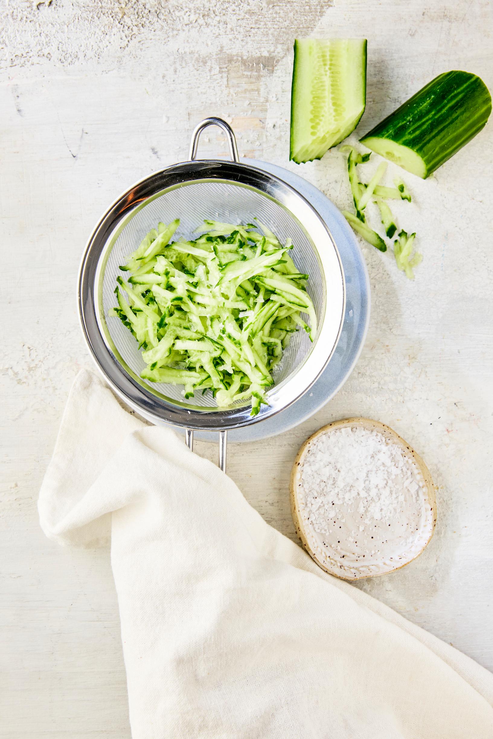 - Pese kurkku hyvin ja raasta se raastimen karkealla terällä. Sekoita kurkkuraasteeseen suola, ja nostele raaste siivilään. Anna tekeytyä 5 minuuttia. Puristele kurkkuraasteesta neste pois.