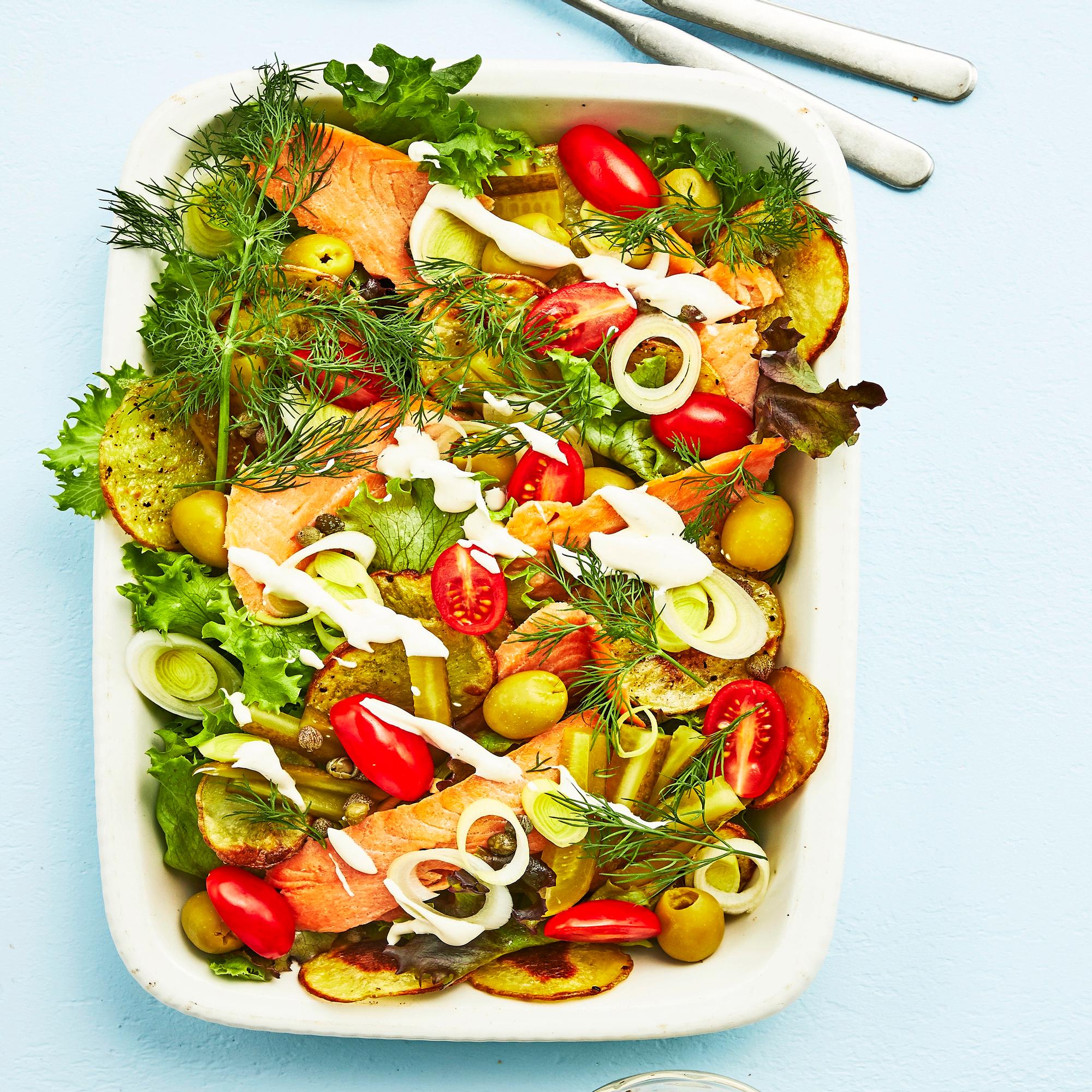 Ota arjen äkkilähtö itänaapuriin! Seljankasalaatti valmistuu nopeasti, sillä sen ohuet peruna- ja lohiviipaleet paistuvat kätevästi yhtä aikaa kiertoilmauunissa.