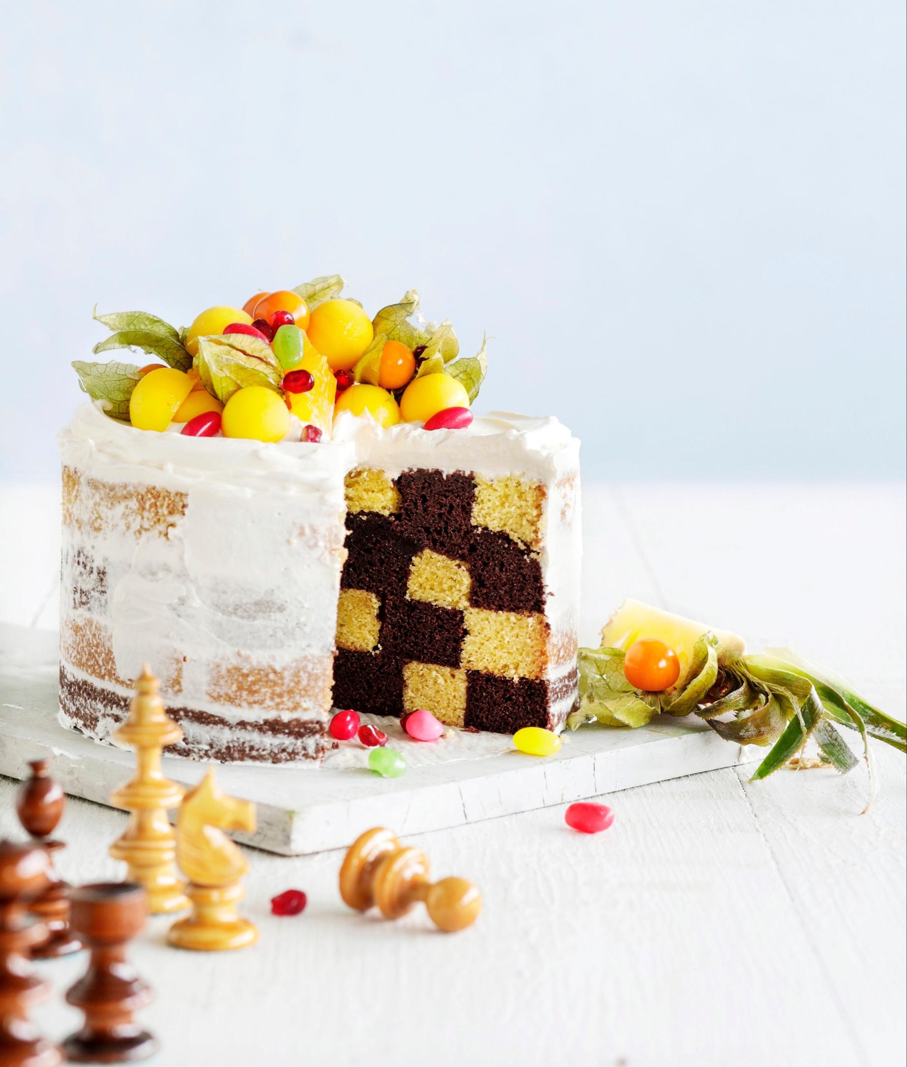 Shakkiruutukakun salaisuus paljastuu vasta leikatessa: kaksi erilaista pohjaa muodostavat yhdessä hauskan kuvion!