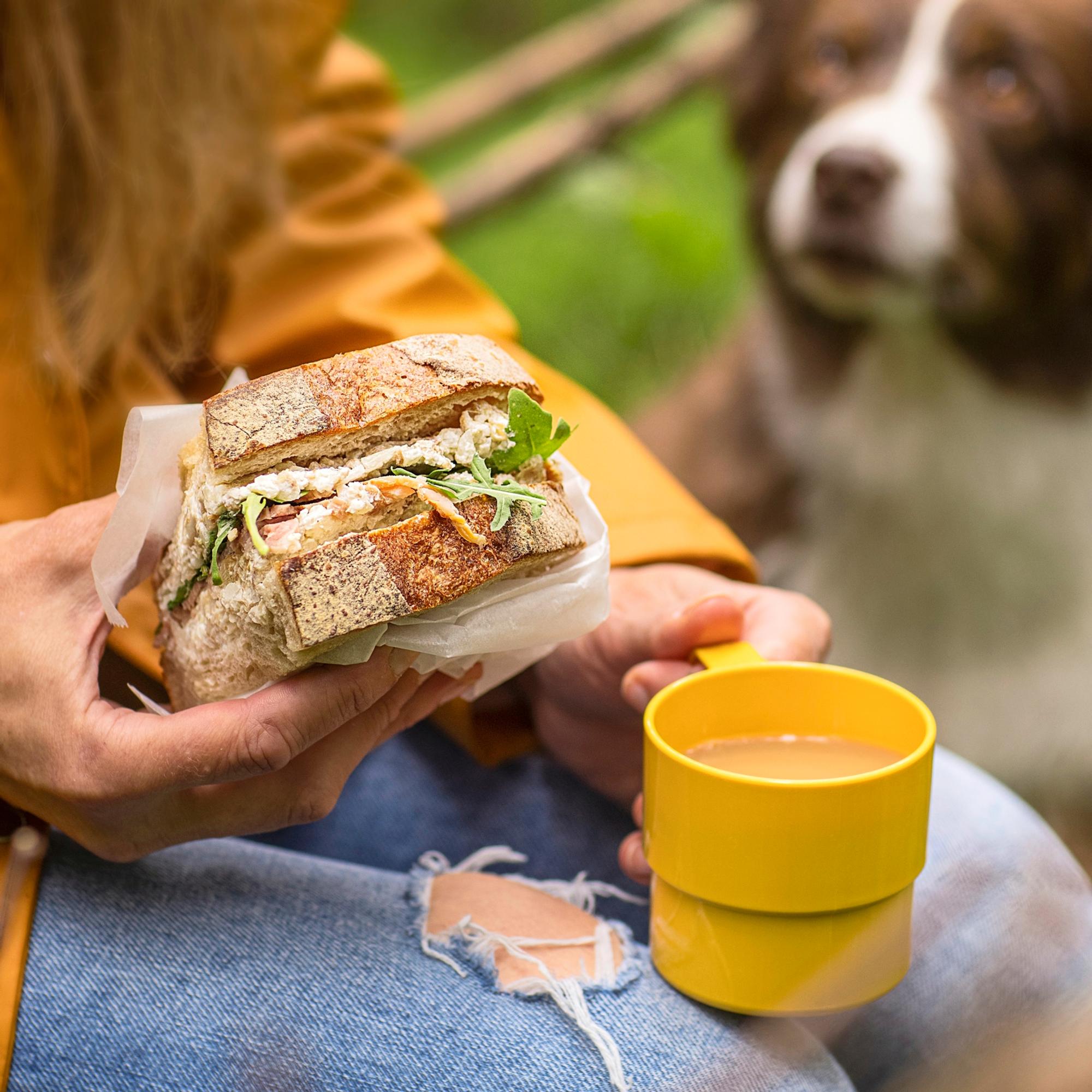 Sienestäjän leipä täytetään nyt maistuvalla metsäsienisalaatilla, reilulla siivulla palvikinkkua ja rucolalla. Maistuvat eväsleivät ja termari repussa on kiva suunnata metsäretkelle!