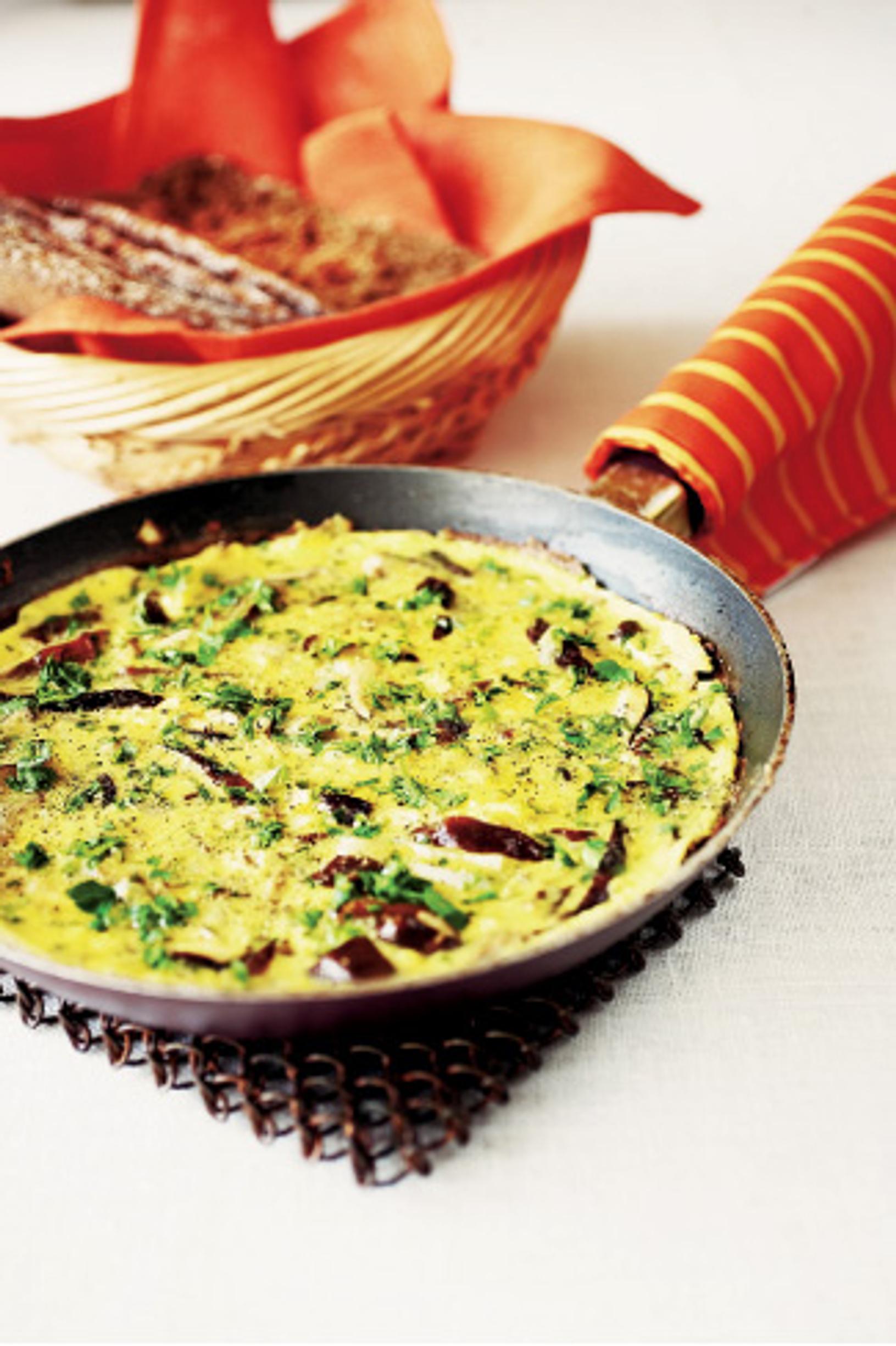 Käytä itse poimittuja pakastesieniä viljeltyjen sienten asemesta munakkaassa.