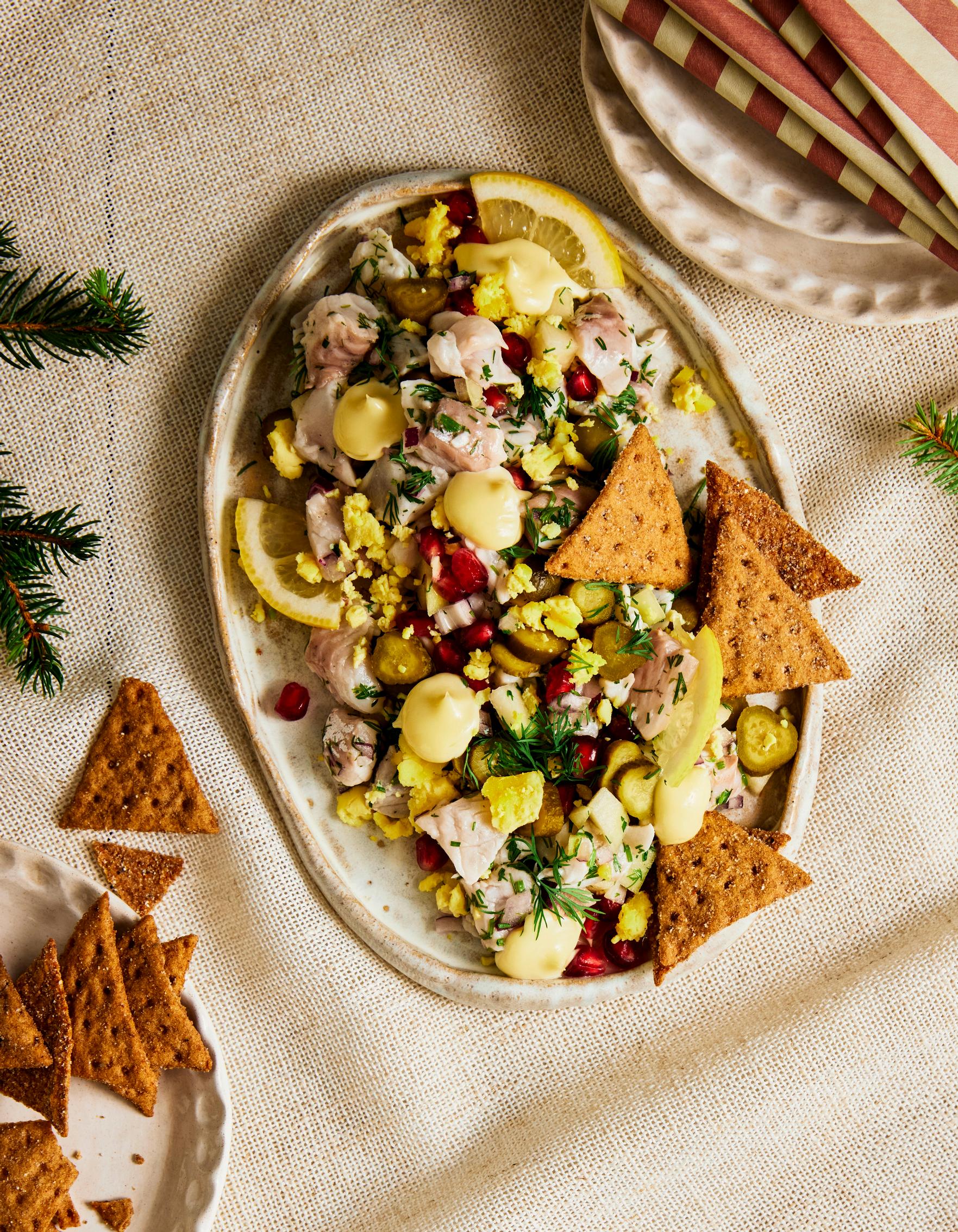 - Murustele päälle keltuaista. Lisää majoneesinokareita. Koristele halutessasi sitruunalohkoilla. Tarjoa ruissipsien kanssa.