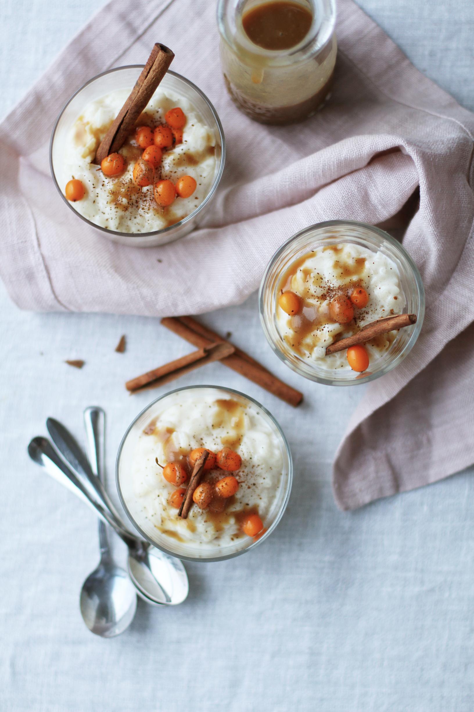 - Annostele riisivanukas tarjoiluastioihin ja jäähdytä kylmäksi jääkaapissa. Koristele tyrneillä ja kinuskikastikkeella.