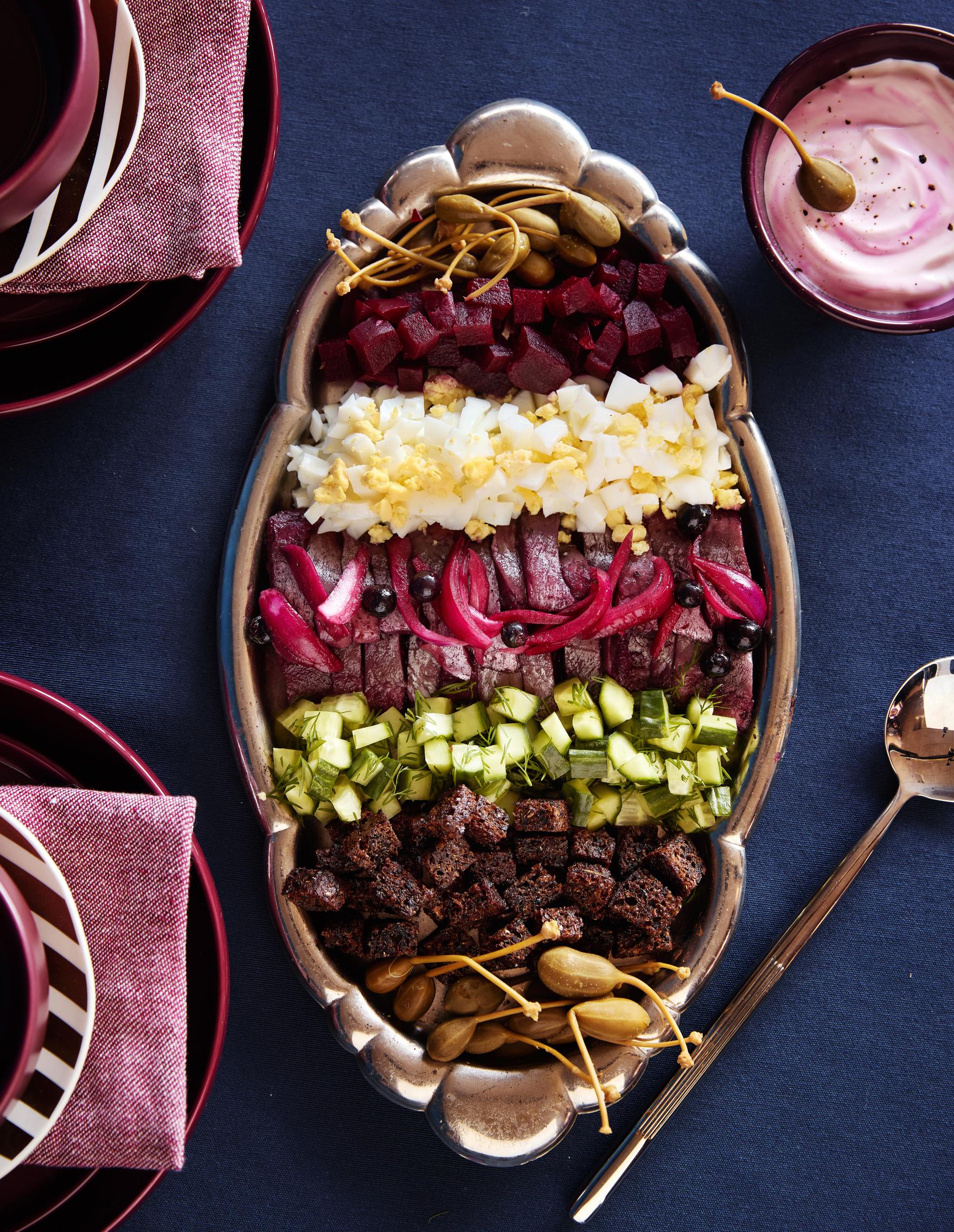 - Kokoa sillin ympärille omiksi raidoikseen mallaslimpusta paahdettuja leipäkuutioita, tillillä maustettuja kurkkukuutioita, keitettyjä kananmunia hienonnettuna ja punajuurikuutioita sekä kapriksia.