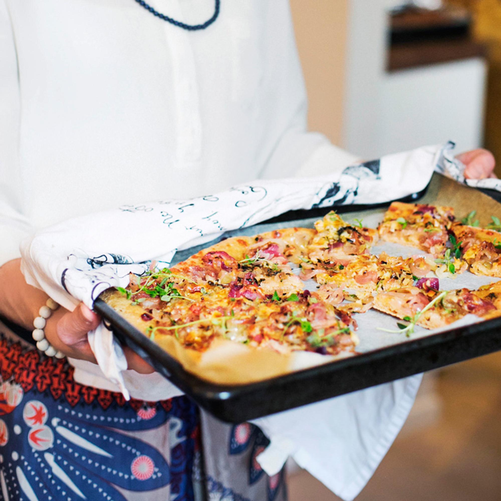 Nams, täyteläinen sipuli-cheddarpiiras sopii niin iltapalalle kuin juhlien pikkusuolaiseksi! Spelttipohja saa ylleen kuminalla ja etikalla maustettua kuullotettua sipulia sekä cheddarjuustoa ja piiraat viimeistellään ennen tarjoilua tuoreella timjamilla.