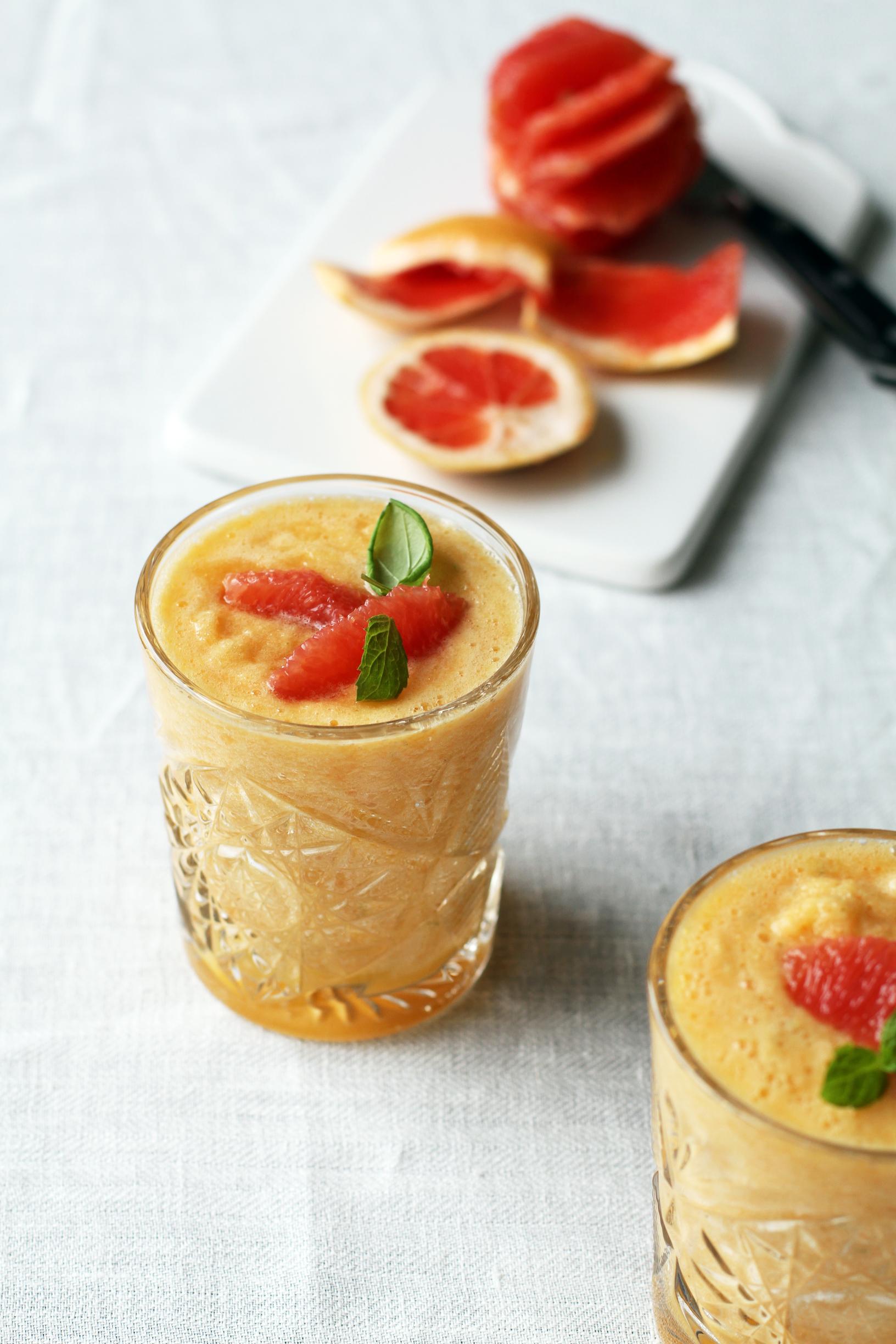 Kirkkaan oranssi smoothie syntyy nopeasti appelsiinista, verigreipistä, porkkanasta ja ananaksesta. Tuoreet hedelmä maistuvat ihanan raikkailta inkiväärin kanssa. Koristele kauniit juomat mintunlehdillä. Kippis terveydelle!