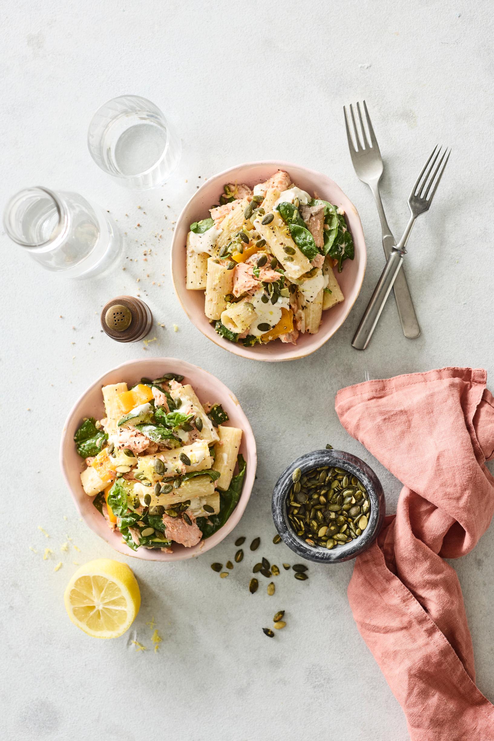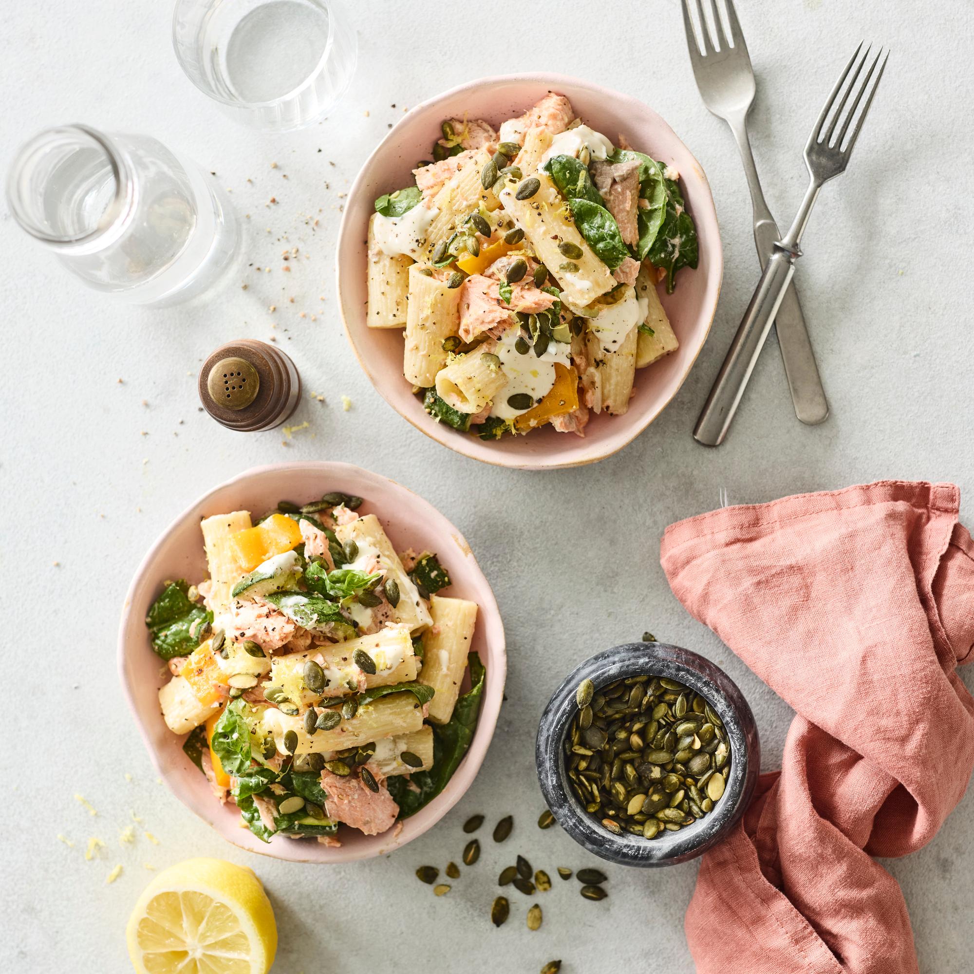 Sitruunan raikastaman lohipastan valmistus on ihanan yksinkertaista: kypsä pasta ja ranskankermakastike sekoitetaan uunissa kypsyneiden kirjolohipalojen ja kasvisten kanssa.