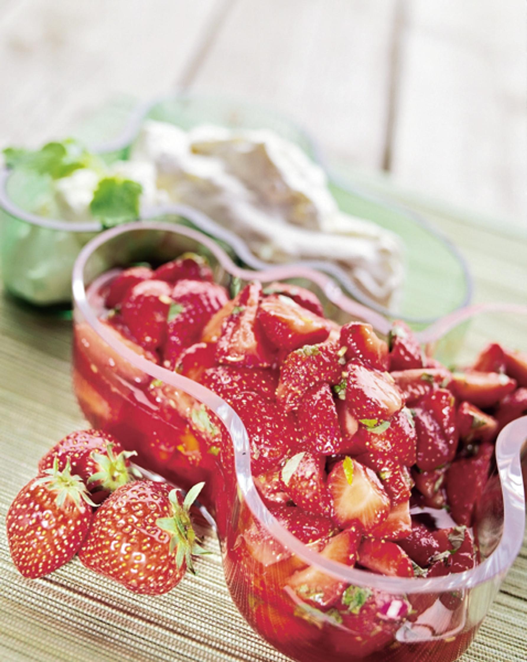 Perkaa ja paloittele mansikat. Sekoita mansikoiden joukkoon varovasti sitruunamehu, sokeri ja hienonnettu sitruunamelissa. Nosta mansikat maustumaan jääkaappiin noin tunniksi.