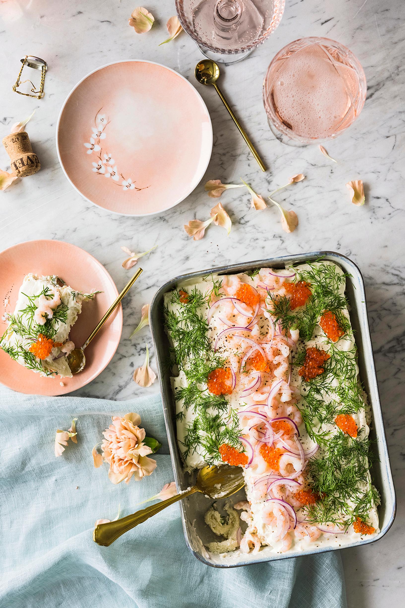 Skagen-voileipäkakku lainaa makunsa klassikkoleivältä – kokoa helppo mutta kaunis kakku näppärästi vuokaan!