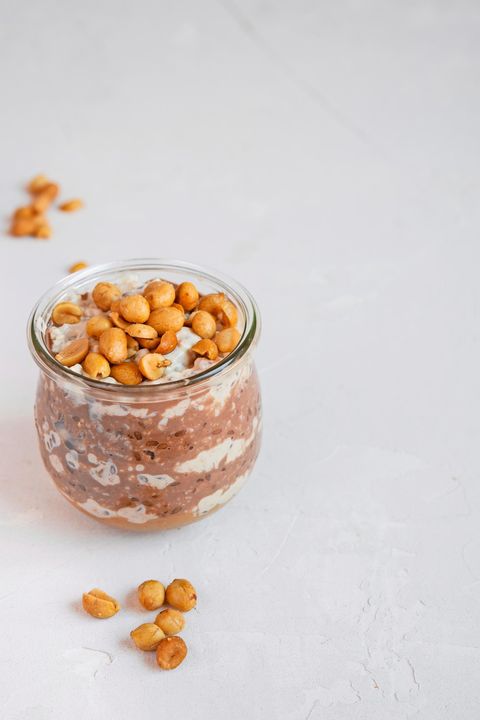 - Kokoa puuroannos kerroksittain lasiin tai kulhoon. Lusikoi 1 rkl maapähkinävoita pohjalle ja lisää vuorotellen päälle vaaleaa ja suklaista puuroa. Ripottele suolapähkinöitä pinnalle.