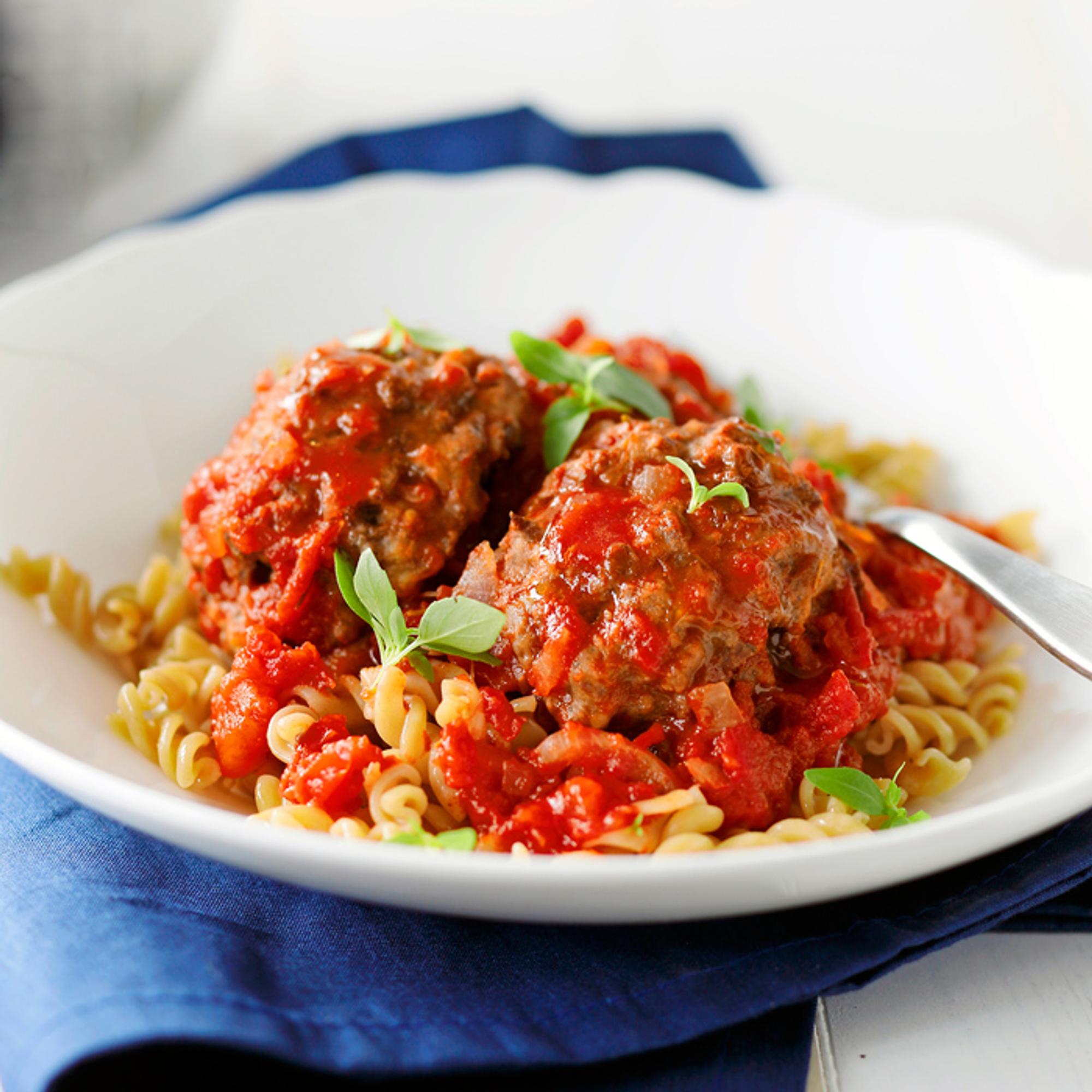 Tarjoa soijapyörykät tomaattikastikkeessa, keitetyn pastan kanssa.
