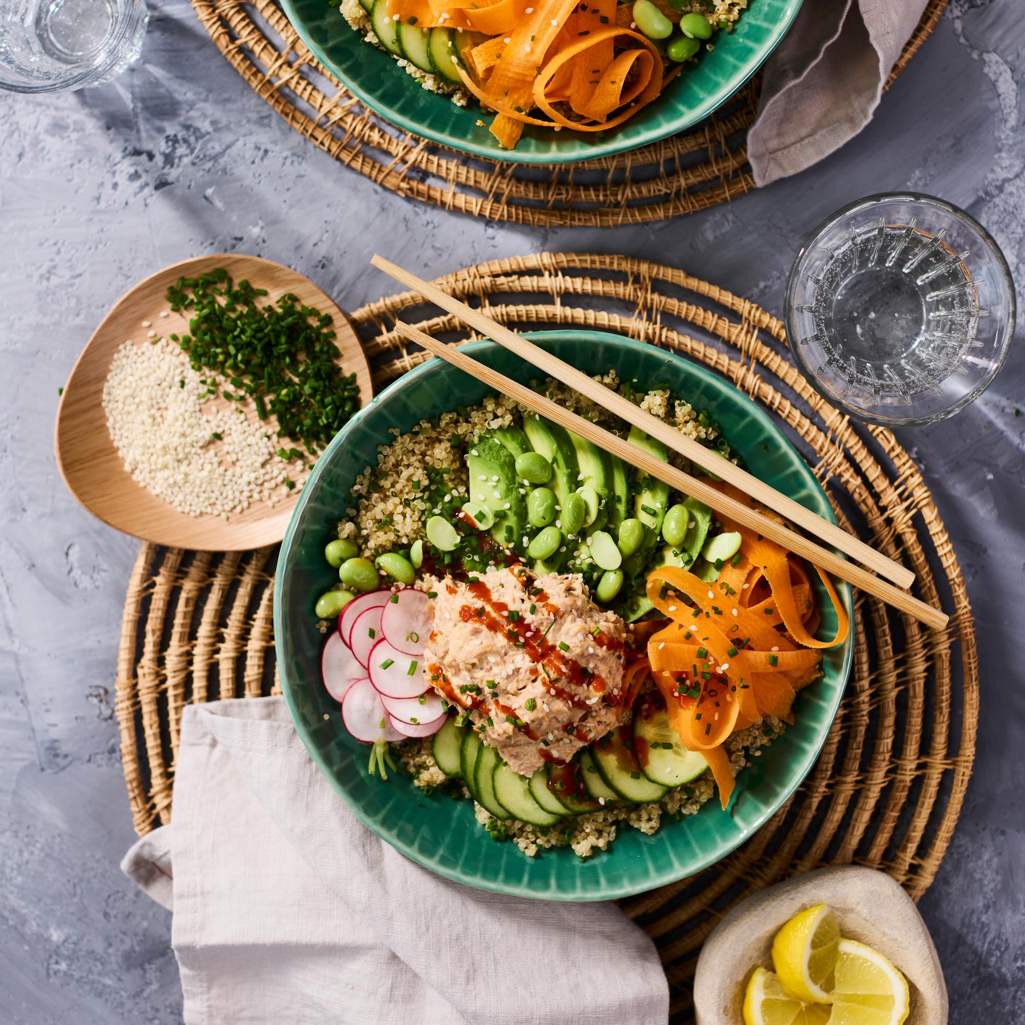 - Jaa kvinoa kulhojen pohjalle ja asettele kasvikset päälle. Lusikoi tonnikalatahnaa kulhojen keskelle. Hienonna ruohosipuli. Viimeistele annokset ruohosipulilla ja seesaminsiemenillä.