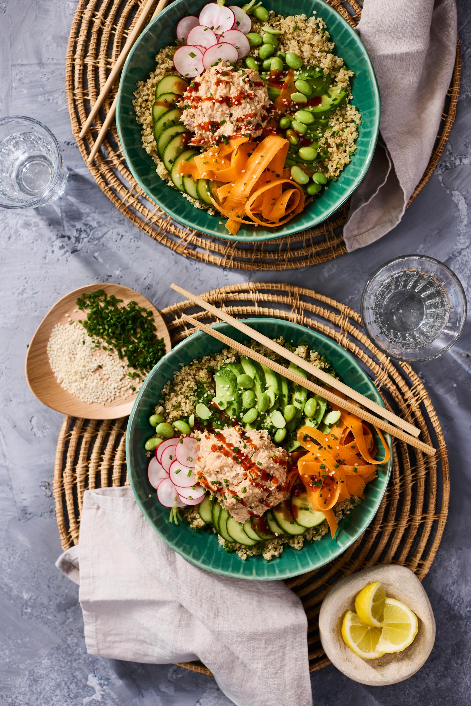 Spicy tuna bowl – värikäs kulho kvinoaa, tonnikalaa ja vihreää rapeutta