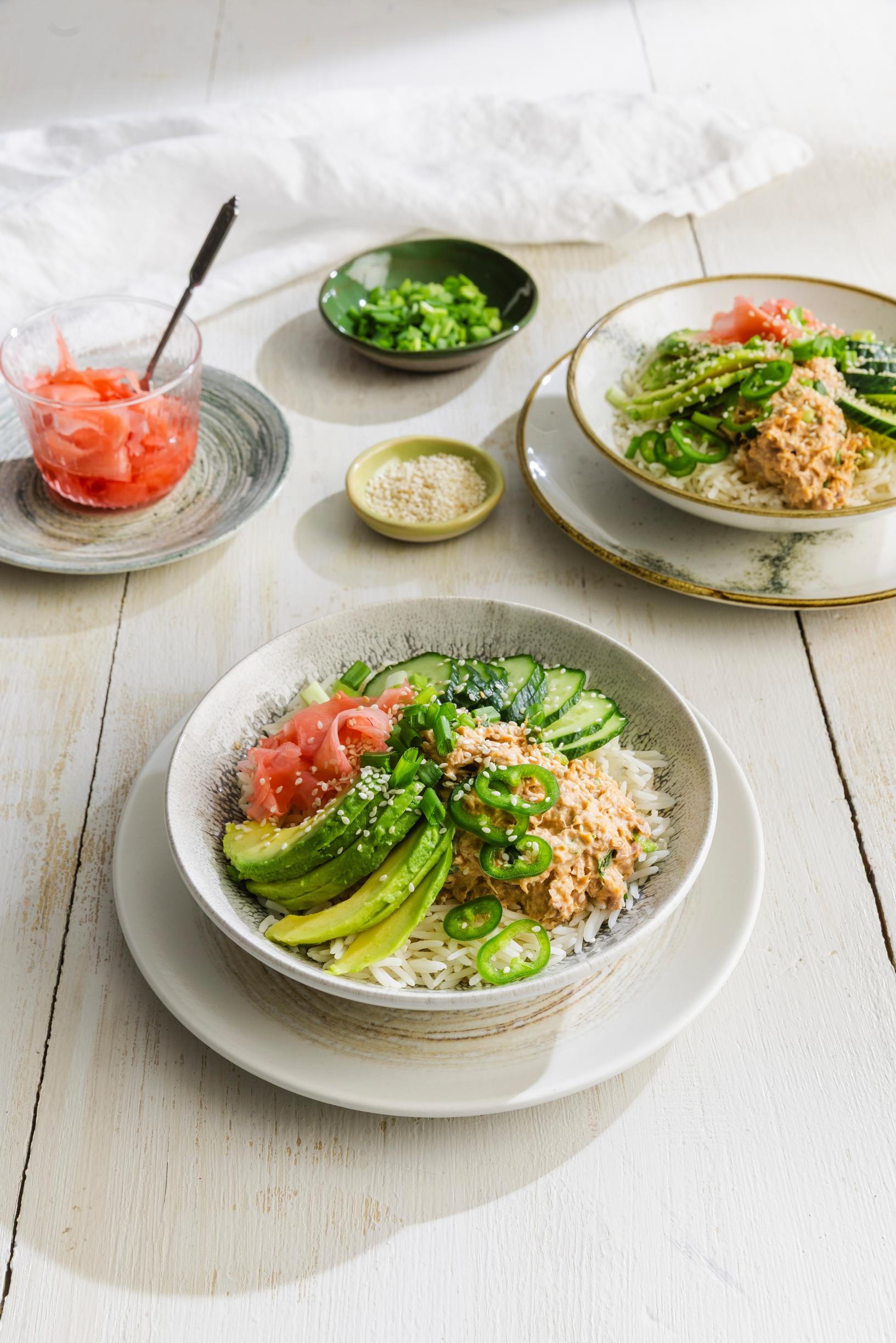 - Lusikoi annoskulhoihin ensin riisiä ja sitten tonnikalaseosta. Lisää päälle avokado- ja kurkkuviipaleita sekä sushi-inkivääriä. Viimeistele hienonnetulla kevätsipulilla, chili- tai jalapenoviipaleilla ja seesaminsiemenillä.
