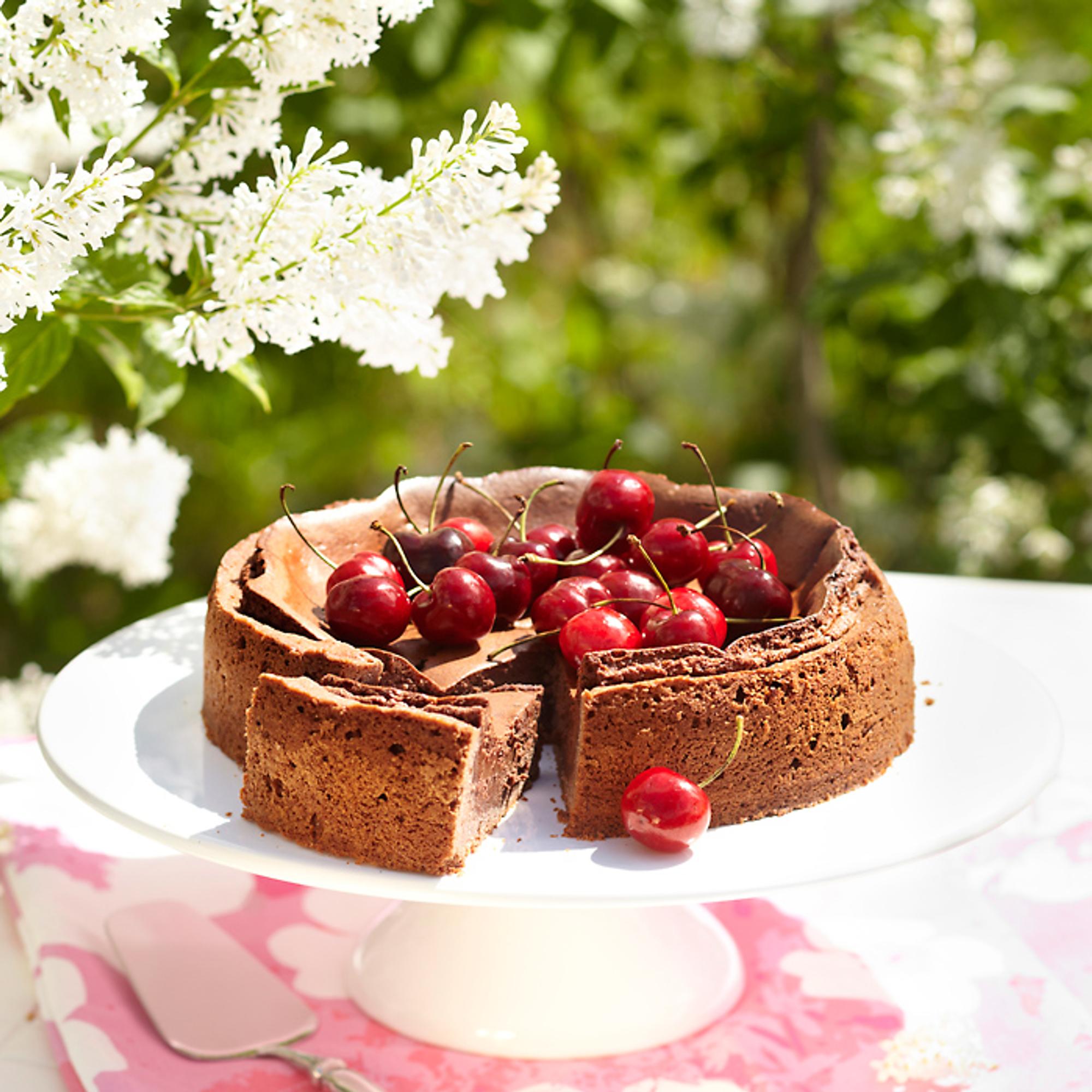 Koristele suklaajuustokakku tuoreilla kirsikoilla.
