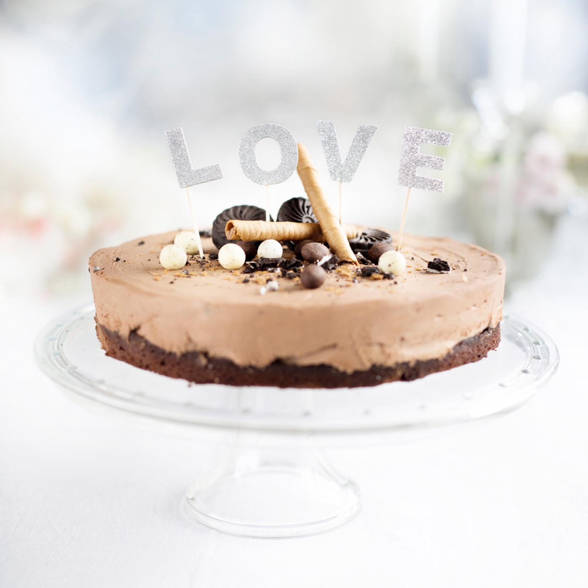 Koristele suklaajuustokakku kaakaojauheella, kekseillä ja karkeilla sekä koristekirjaimilla.