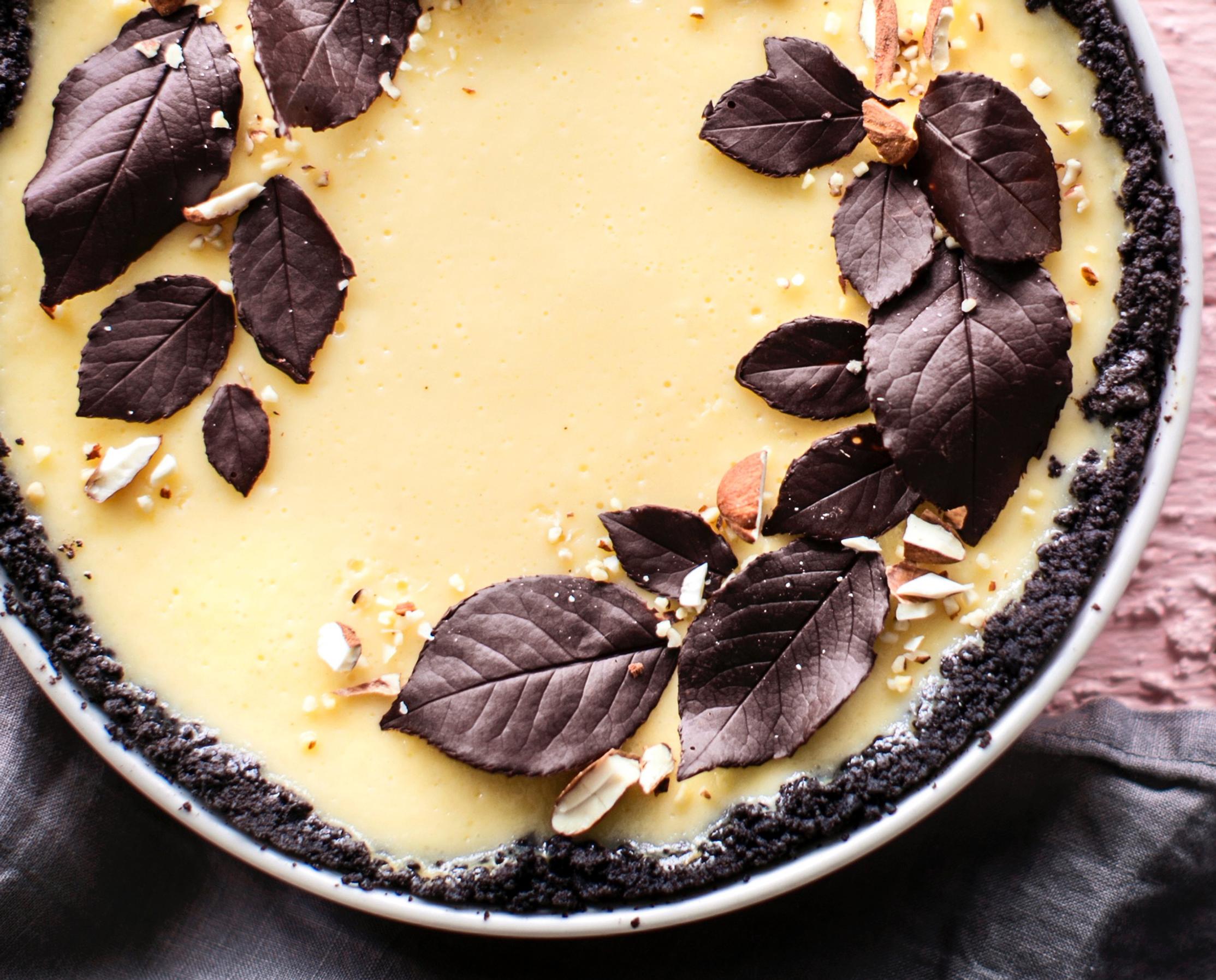 Koristele suklaalehdillä tuorejuustopiirakka tai muita leivonnaisia.