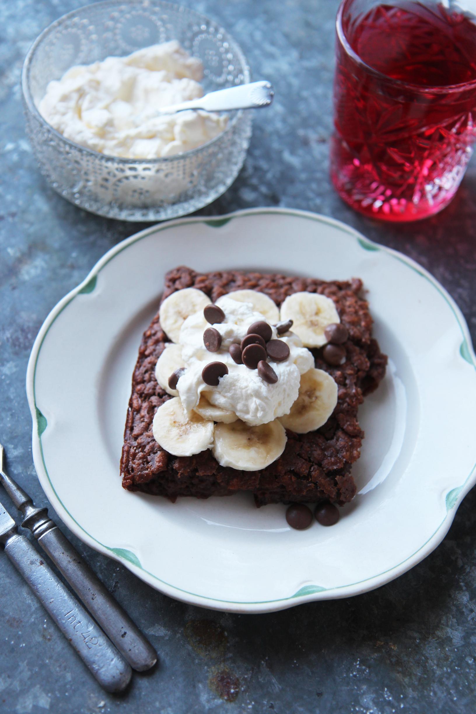 Herkuttelupäivän suklainen banaanipannari valmistuu nopeasti uunissa. Kaakaojauhon ja suklaahippujen lisäksi taikinaan solahtaa pari banaania sekä iso kasa riisimuroja.