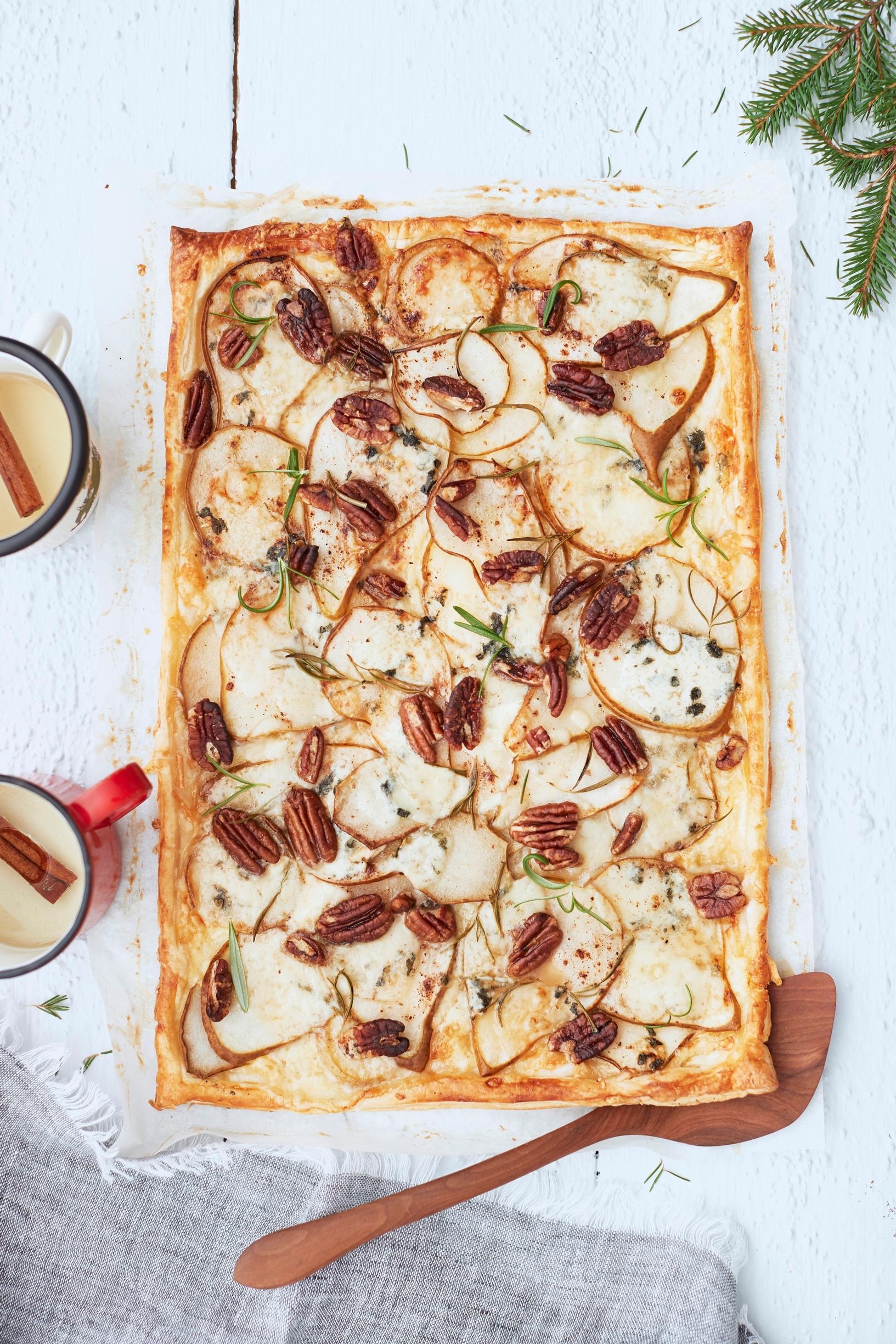 Suolainen päärynäpiirakka – pekaanipähkinät, sinihomejuusto ja tuore rosmariini aateloivat helpon peltiherkun