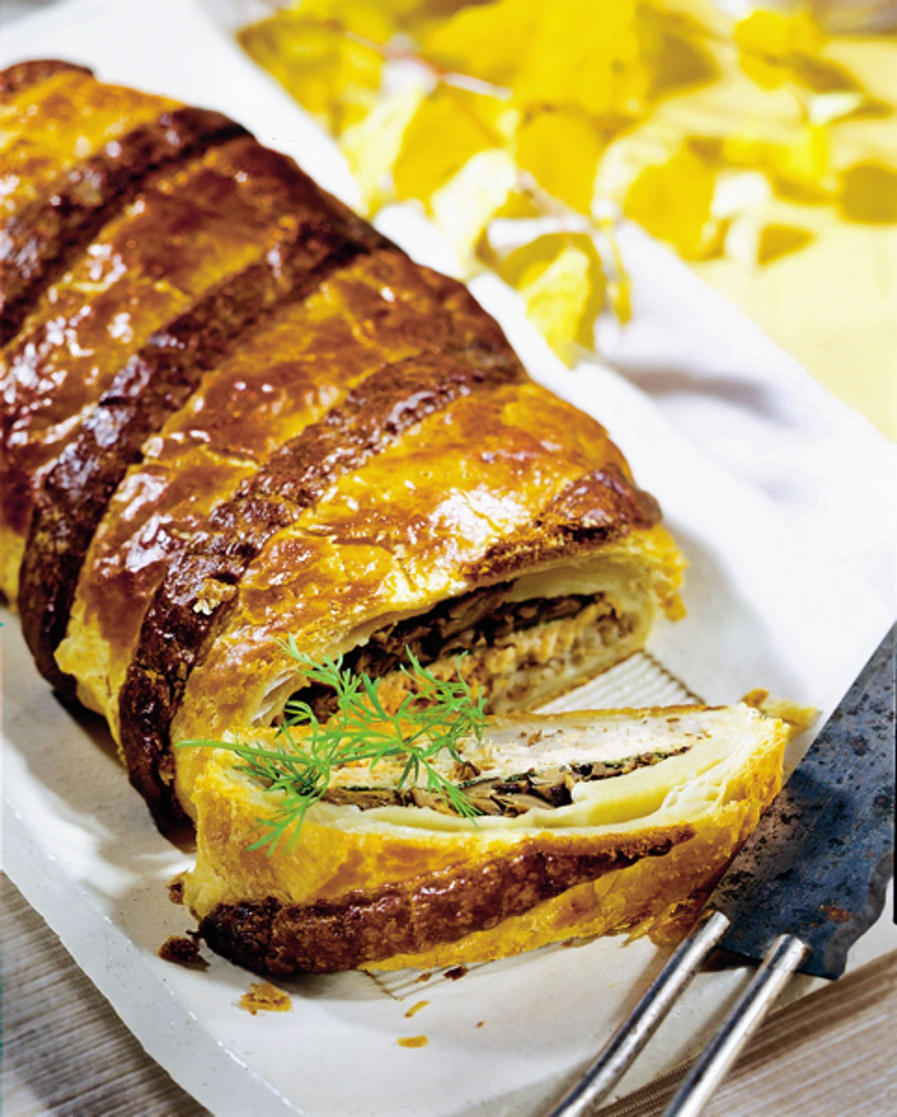 Lado seuraavaan kerrokseen kalaviipaleet ja mausta sitruunapippurilla ja tillillä. Levitä päällimmäiseksi pilkotut suolasienet. Voitele voitaikinan reunat kevyesti vatkatulla munalla. Nosta ensin taikinan lyhyemmät sivut ylös ja ummista paketti.