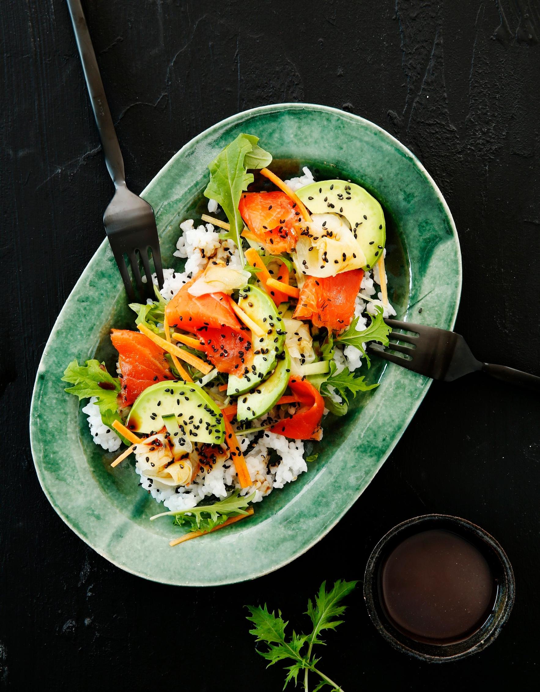 Sushisalaatti tuo suosikkiruoan makumaailman lautasellesi ilman näpertämistä tai rullailua. Jos jääkaapistasi löytyy valmiiksi keitettyä sushiriisiä, onnistuu salaatin kokoaminen vieläkin vauhdikkaammin.