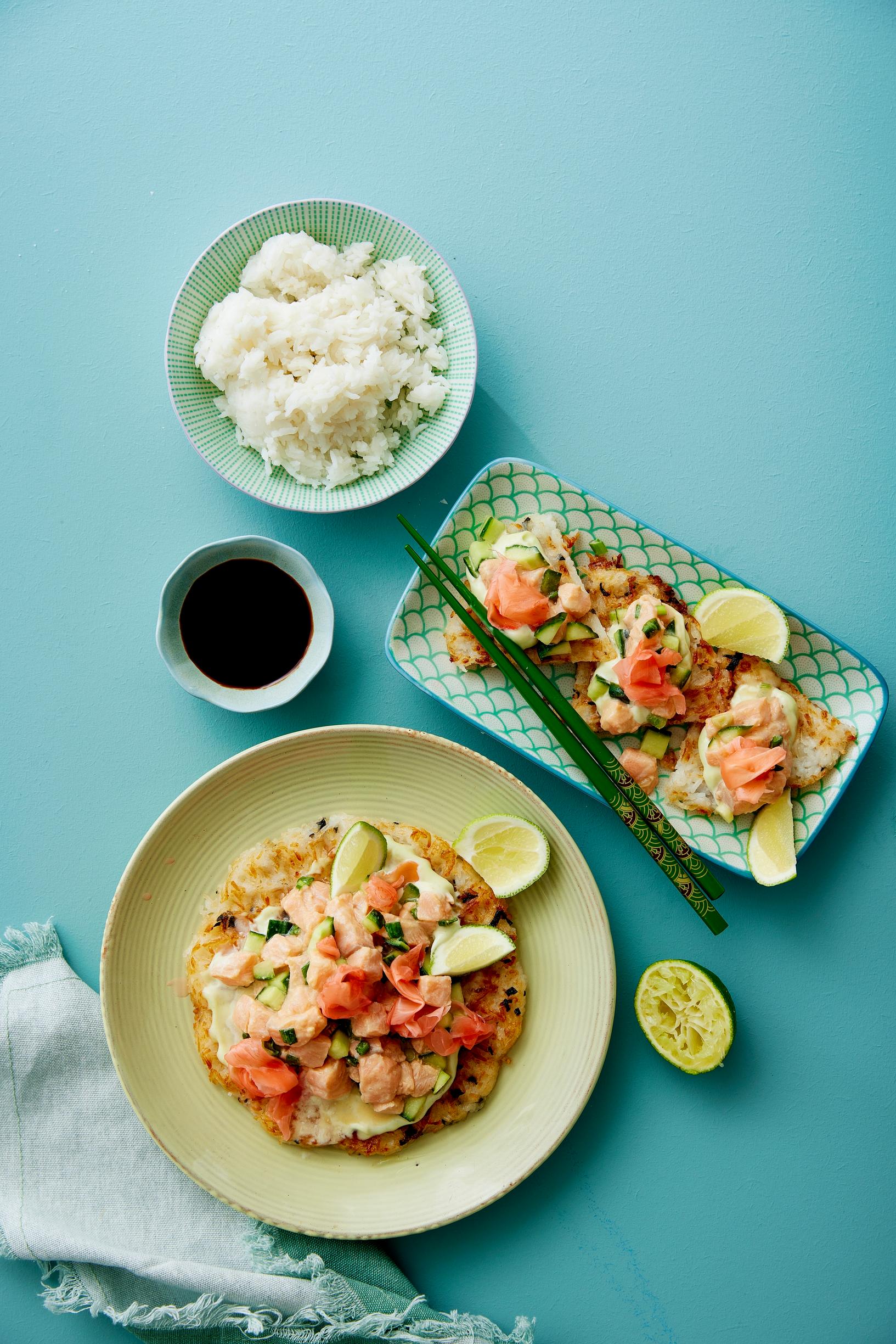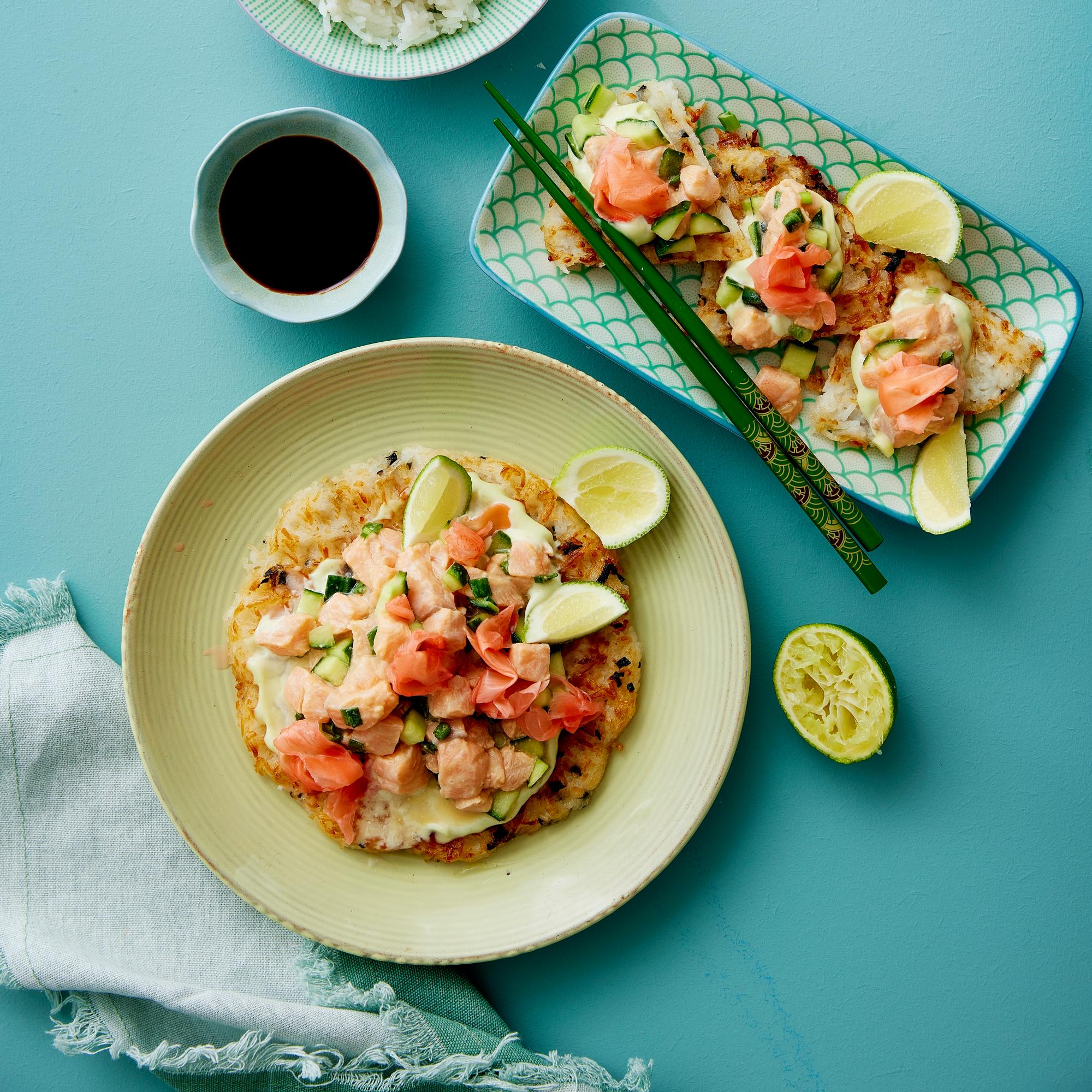 Sushivohvelit ovat ihana rapea herkku, johon uppoaa eilisen ylijäämäriisi. Kokoa päälle lohta, sushi-inkivääriä ja kurkkua. Kasvisversion teet helposti marinoidusta tofusta.