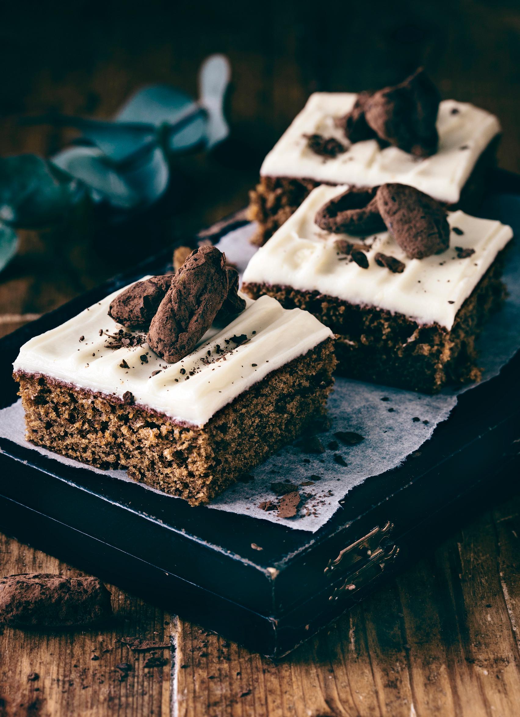 ”Peltitaatelikakku on saanut innoituksensa porkkanakakusta, ja sen päällä onkin samanlainen tuorejuustokuorrute. Kakun koristeeksi lisäsin kaakaojauhoissa pyöriteltyjä taateleita, jotka ovat sellaisinaan kuin karkkia. Valitse tähän kakkuun hyvälaatuisia taateleita, sillä juuri tässä kakussa taatelin maku on kaiken a ja o. Mielestäni irtonaisina myytävät taatelit maistuvat parhaimmilta.”