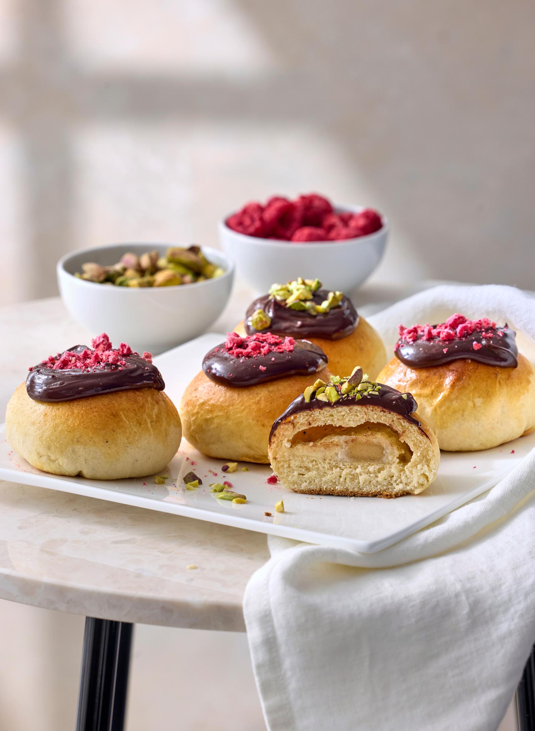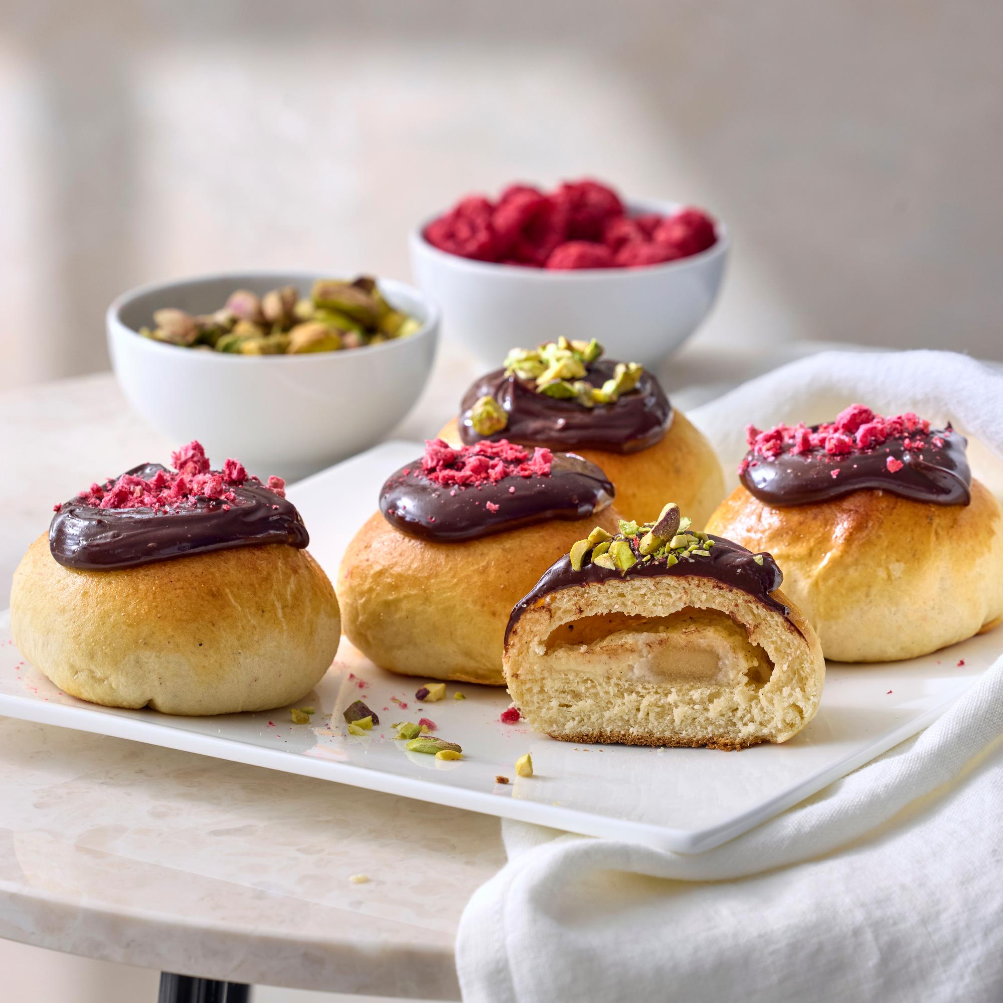 - 10Levitä suklaaganache jäähtyneiden pullien päälle. Viimeistele rouhituilla pistaasipähkinöillä tai kuivatulla vadelmamurulla.