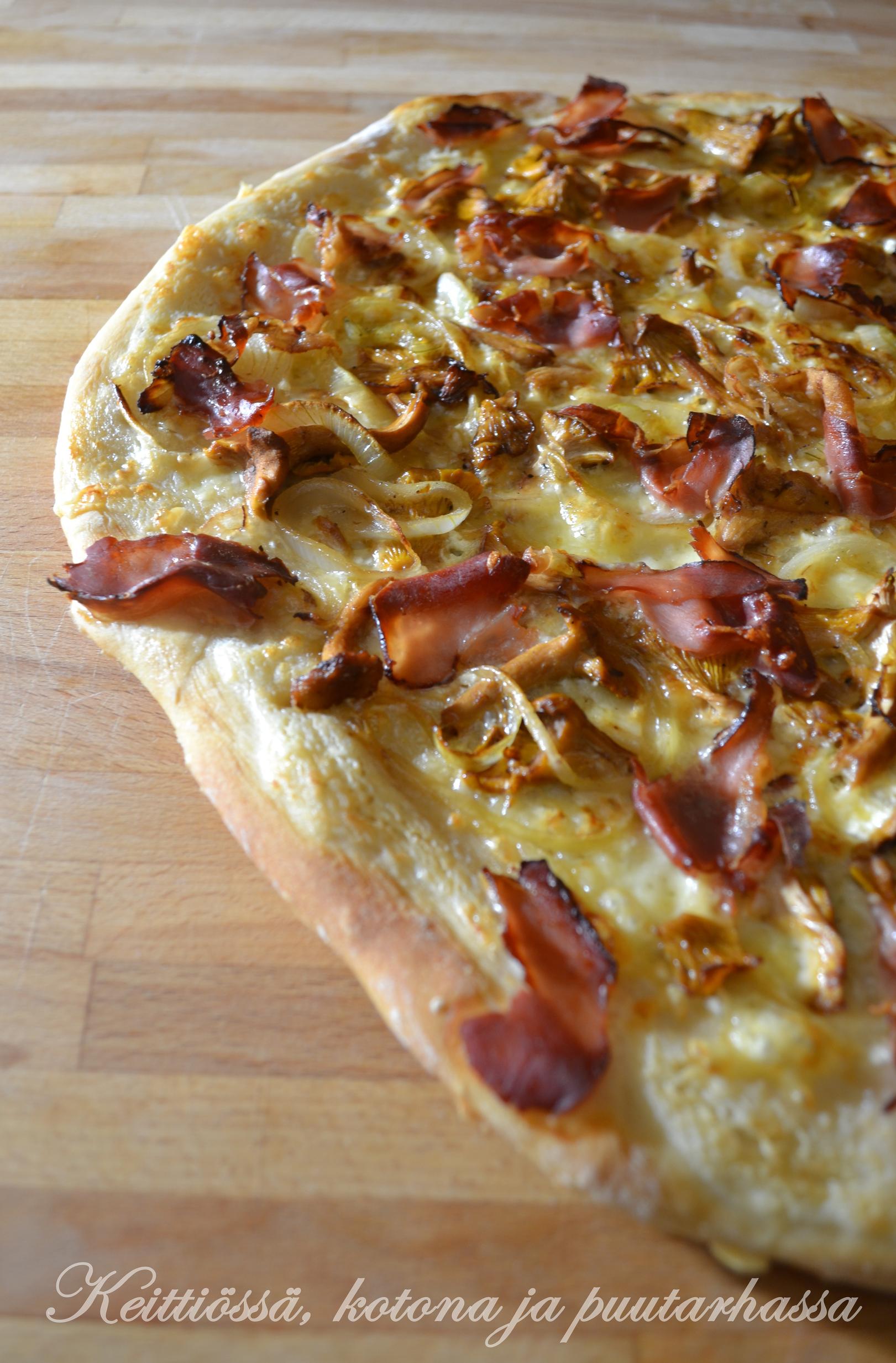 Kaulitse taikina ohueksi suurin piirtein ympyrän muotoiseksi pohjaksi ja nosta kaulimen avulla leivinpaperin päälle. Levitä lusikalla ranskankerma pohjan päälle tasaisesti. Ripottele raastettu emmental pohjan päälle. Lisää paistetut kantarellit ja sipulit.